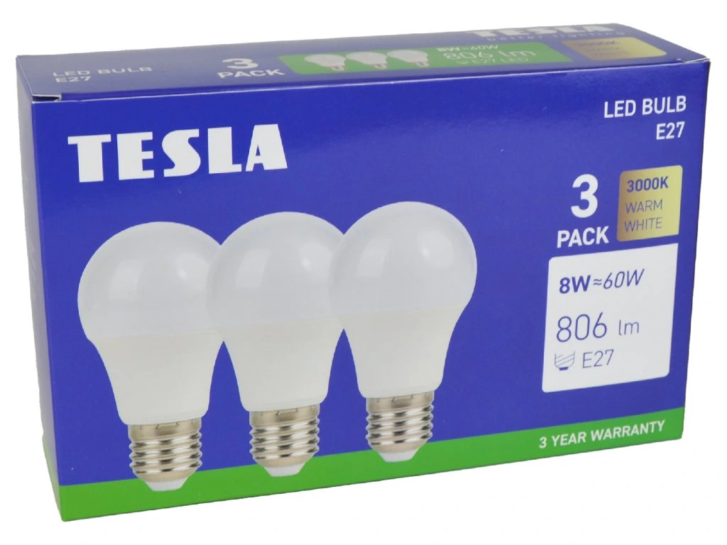 💡LED žárovka Tesla BULB E27 přináší kvalitní a úsporné osvětlení s teplou bílou barvou (3000K) a vysokou svítivostí 806 lm. Díky moderní LED technologii nahradí klasickou 60W žárovku s výraznou úsporou energie až 85 %. Široký úhel svícení 220° zajišťuje rovnoměrné rozprostření světla, takže je ideální volbou pro obývací pokoje, ložnice i dětské pokoje.