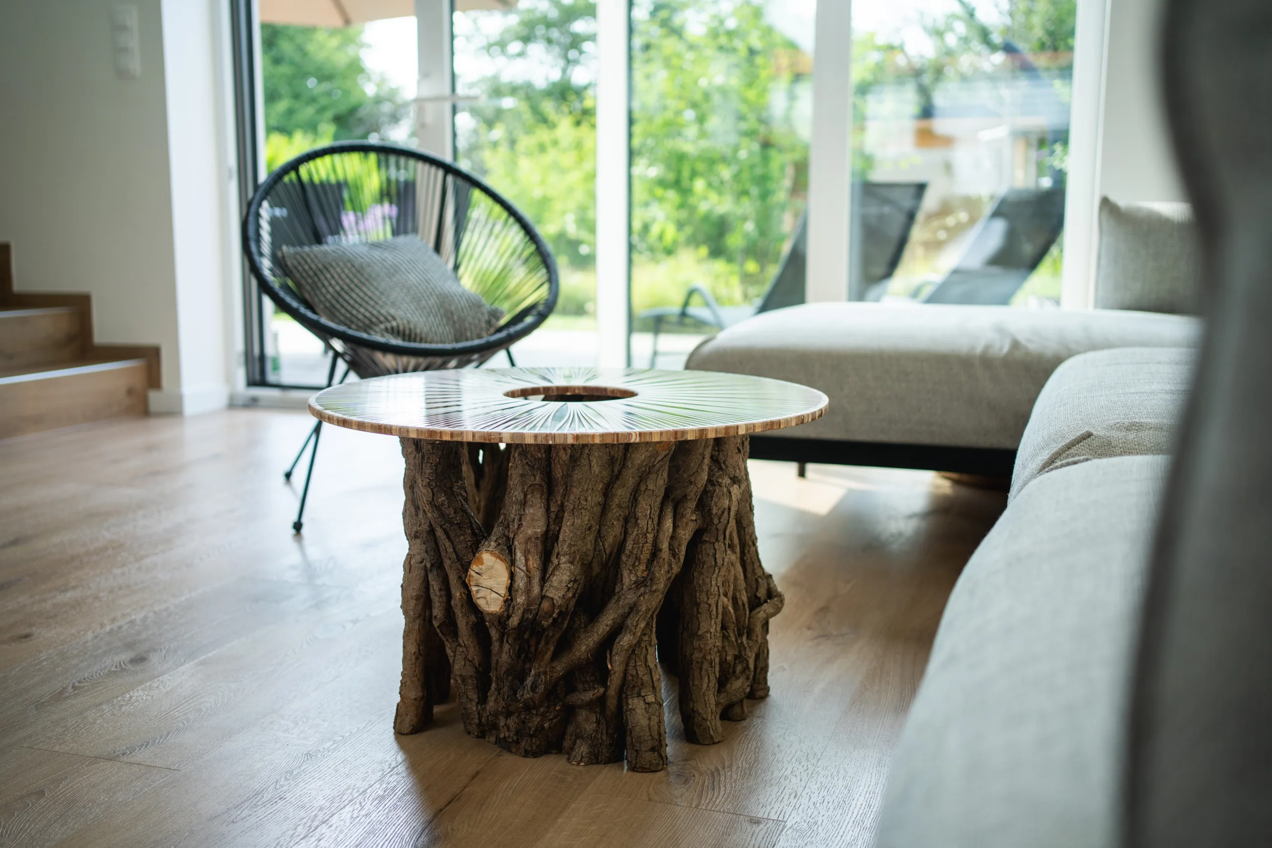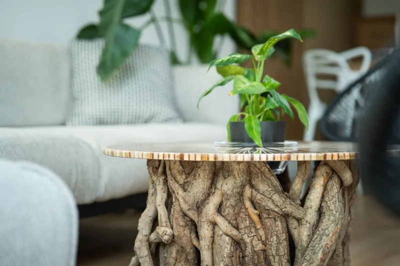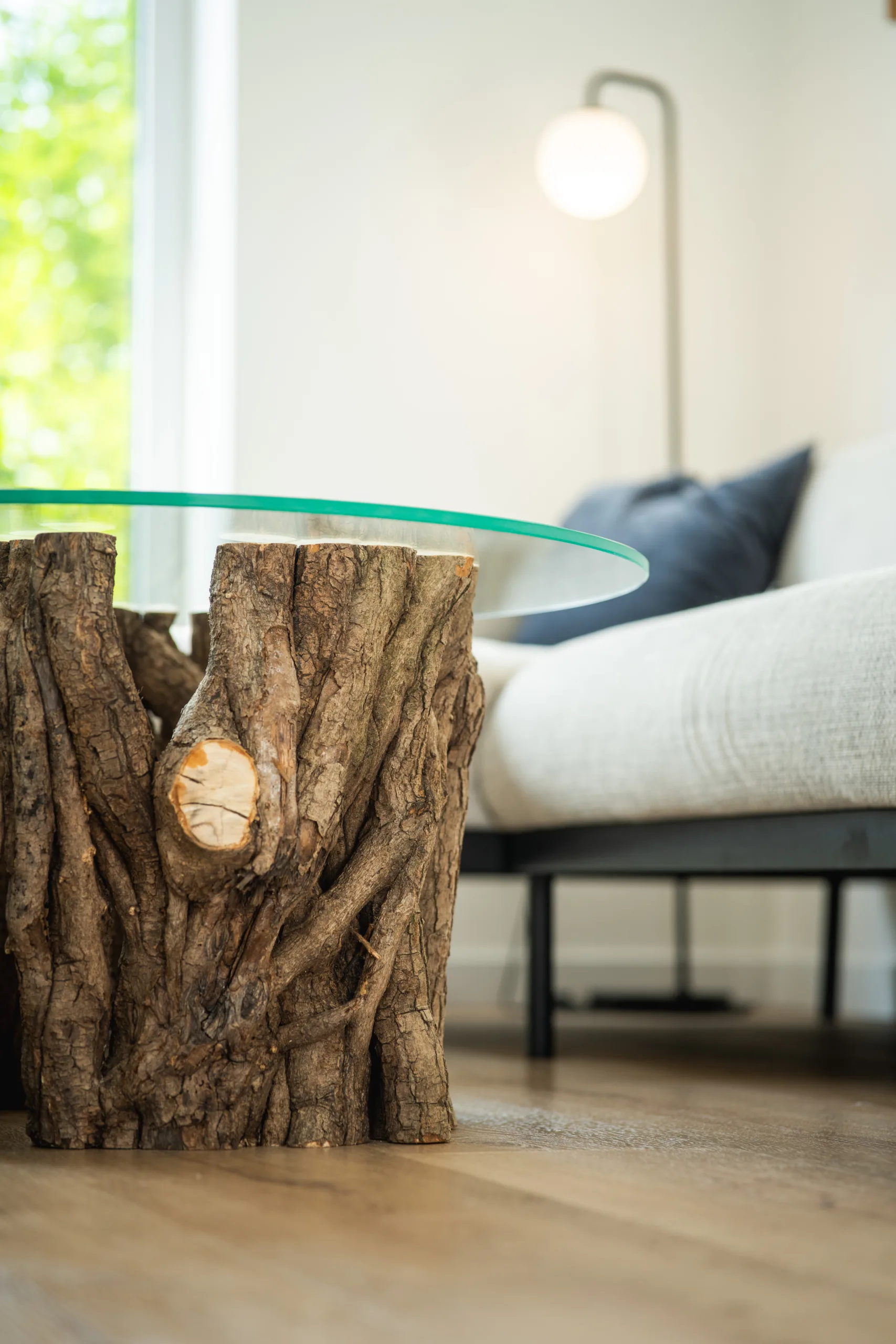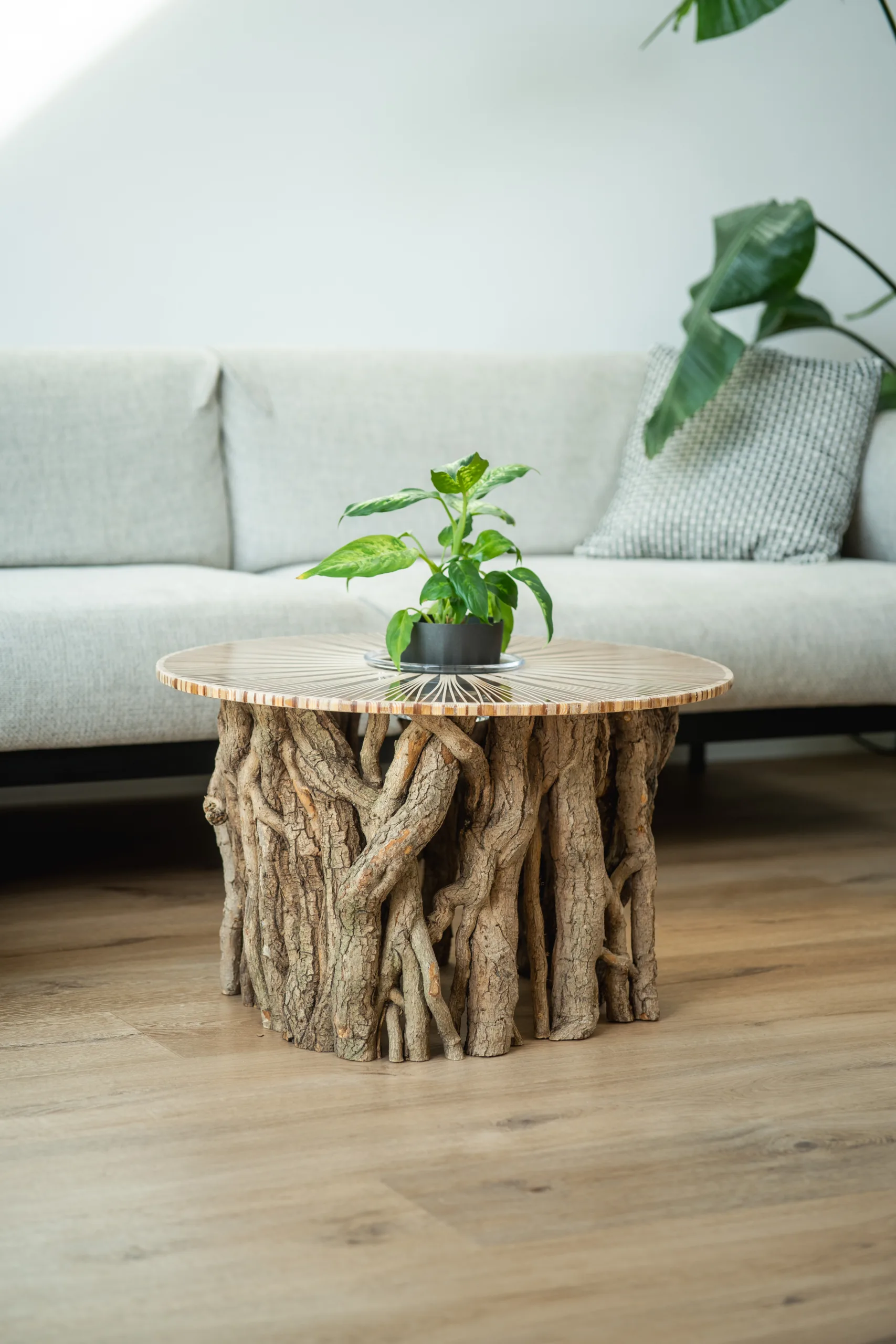 Máte několik možností finální úpravy – při volbě epoxidové nebo skleněné desky se v horní části podnože odhalí průřezy větvemi, kde lze spatřit detailní kresbu letokruhů. Stůl Bon Lunelle je navržen pro stolové desky o průměrech 60, 70 i 80 cm, což umožňuje přizpůsobení různým potřebám prostoru. Naše oblíbená kombinace je s deskou Arbo Iris, jejíž střed můžete doplnit květináčem. Vybrat si však můžete kteroukoliv desku z naší pestré nabídky. Náš koncept umožňuje volně kombinovat podnože s různými stolovými deskami.