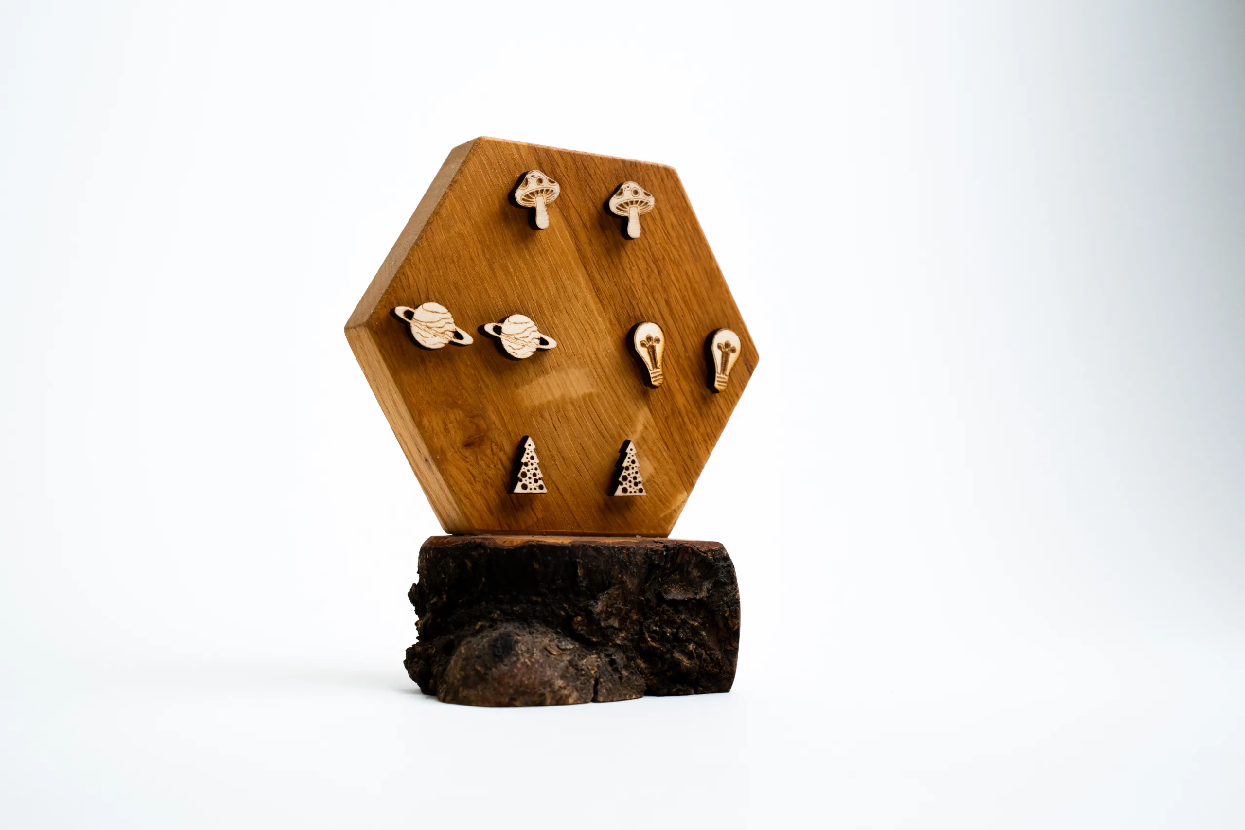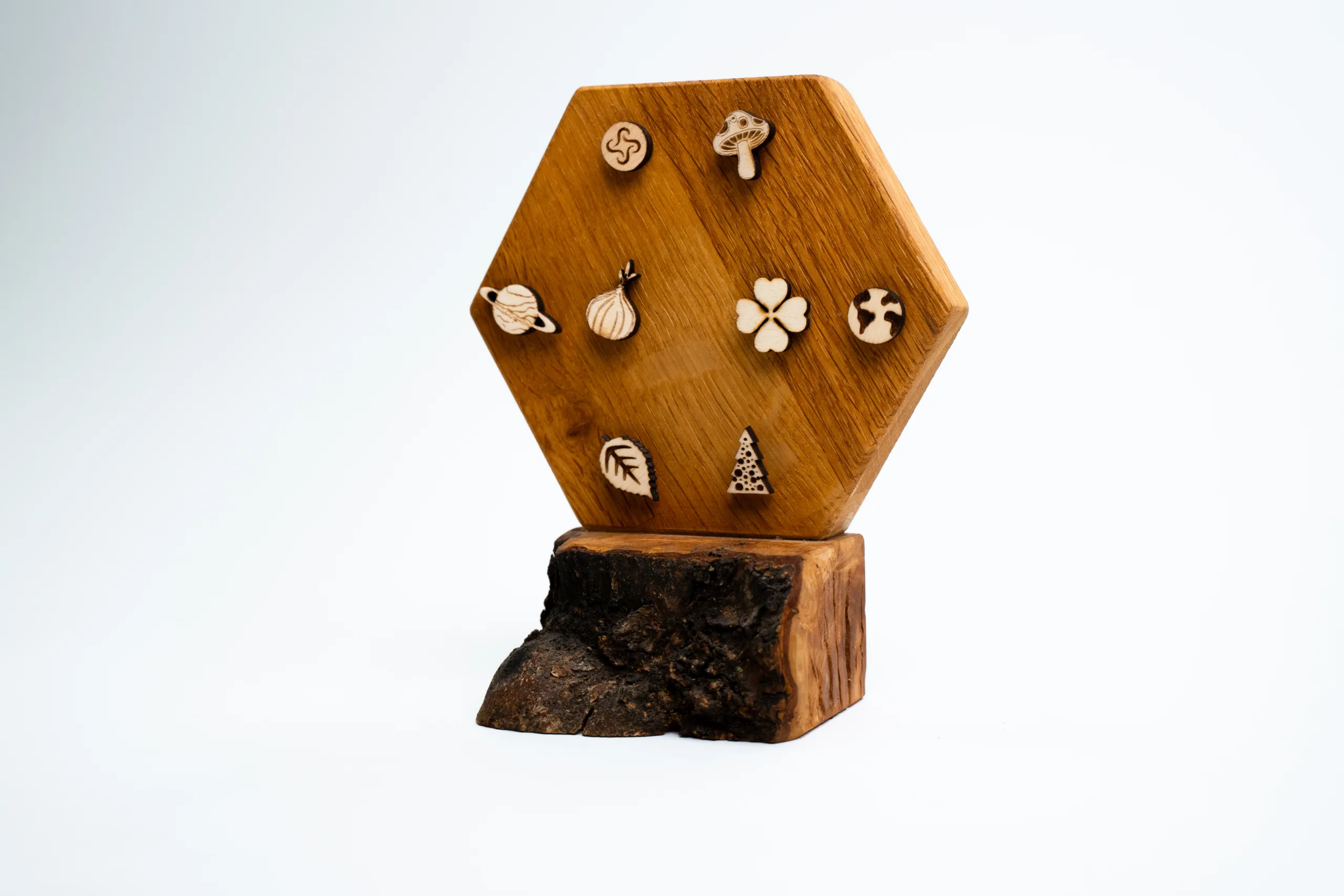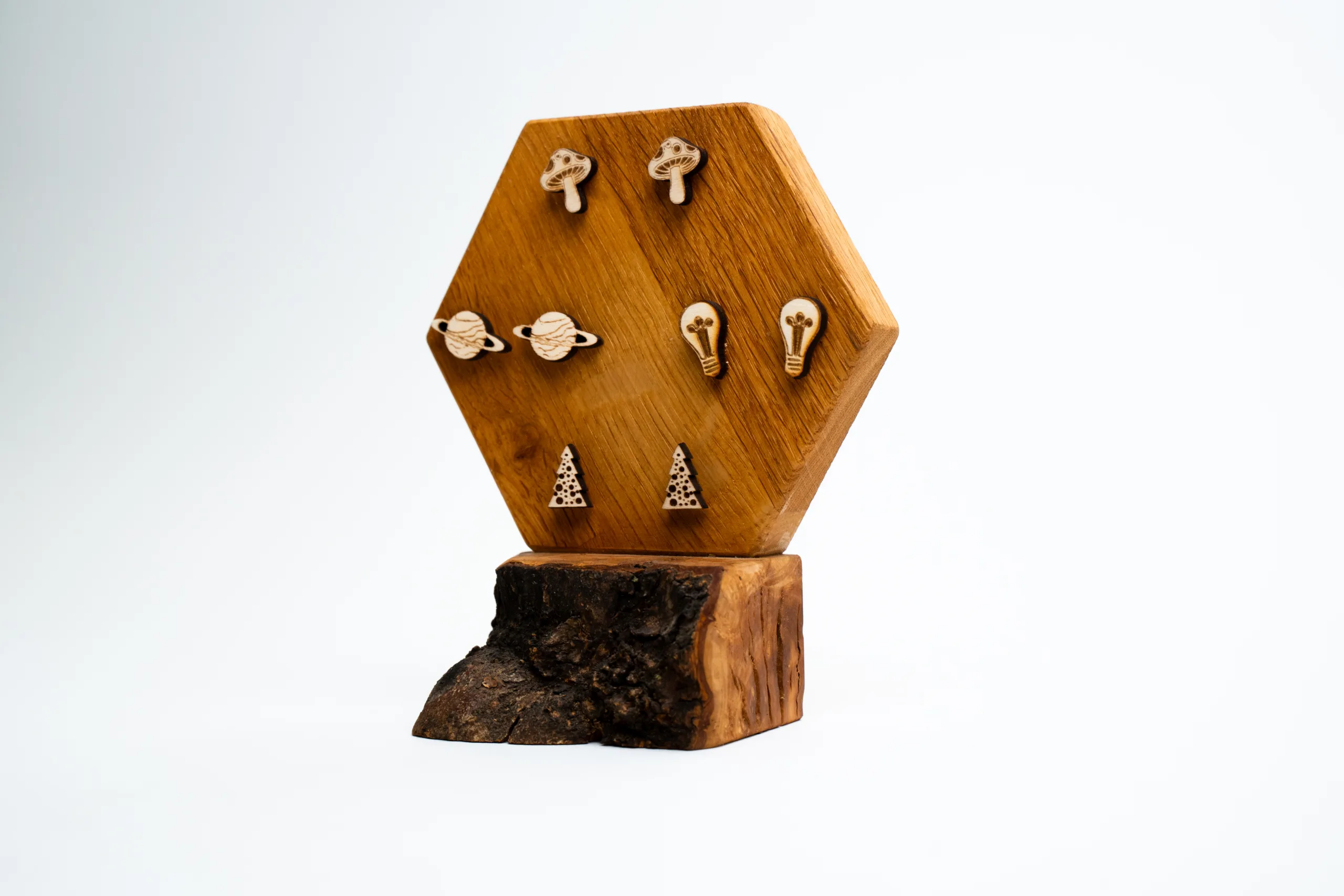 Decentní doplněk vašeho interiéru, díky kterému však budete mít svoje náušnice na dosah ruky pokaždé, co se vydáte ven. Stojan Oliver umožní přehledně zorganizovat vaši sbírku náušnic. Každý kus je výsledkem precizní ruční práce, díky níž vynikne textura a charakter dřeva. Každý kus je jedinečný originál. V naší dílně totiž rádi využíváme přirozené krásy dřeva a ruční zpracování nám umožňuje podtrhnout unikátní vlastnosti jednotlivých dřevin.