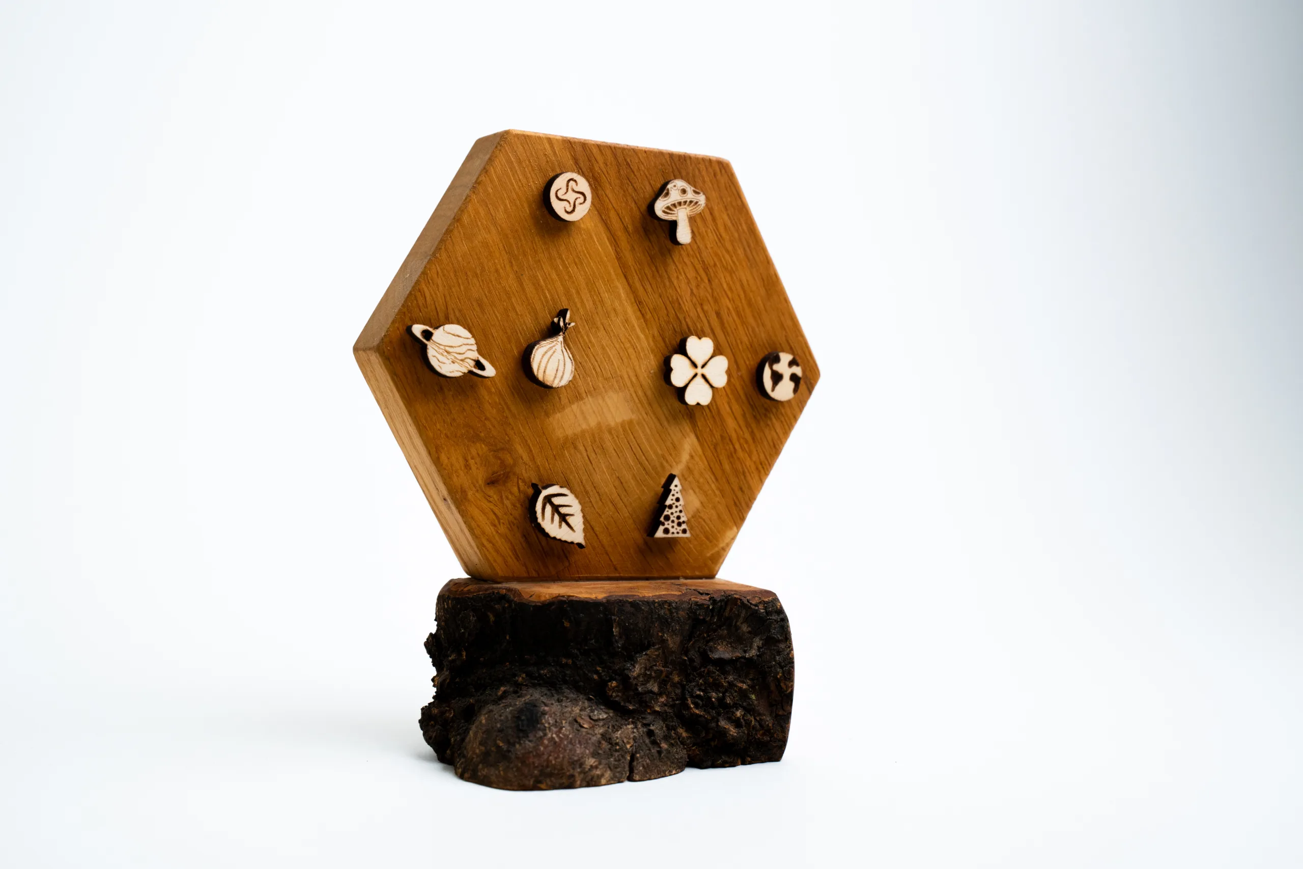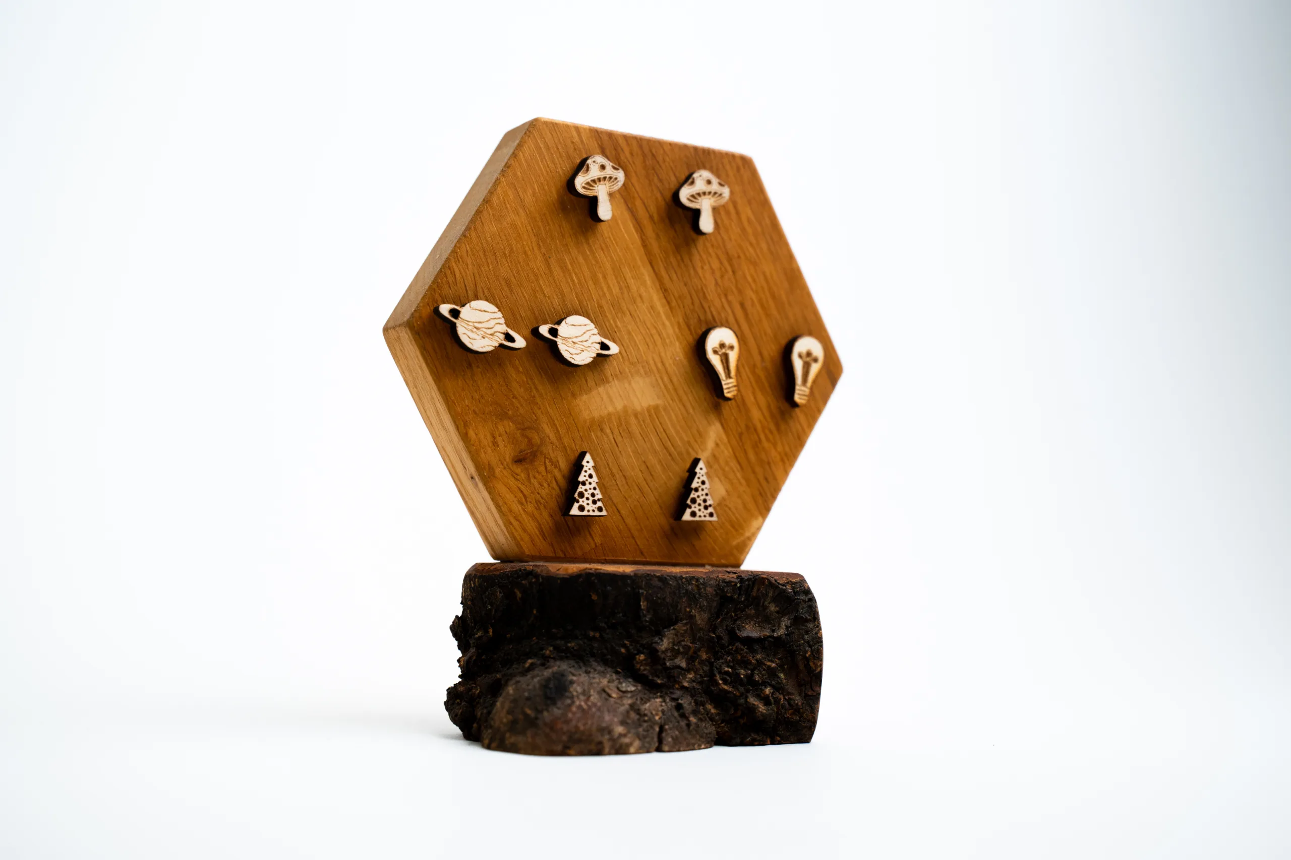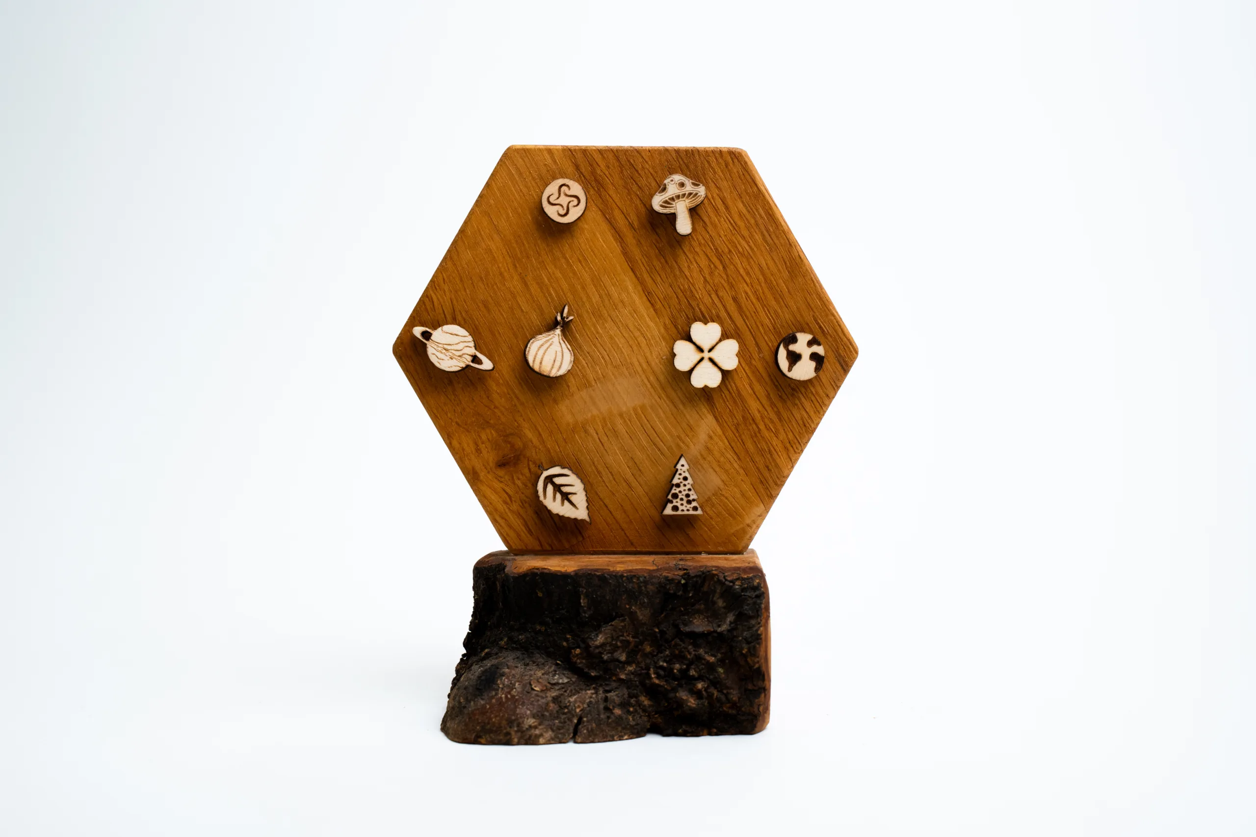 Decentní doplněk vašeho interiéru, díky kterému však budete mít svoje náušnice na dosah ruky pokaždé, co se vydáte ven. Stojan Oliver umožní přehledně zorganizovat vaši sbírku náušnic. Každý kus je výsledkem precizní ruční práce, díky níž vynikne textura a charakter dřeva. Každý kus je jedinečný originál. V naší dílně totiž rádi využíváme přirozené krásy dřeva a ruční zpracování nám umožňuje podtrhnout unikátní vlastnosti jednotlivých dřevin.