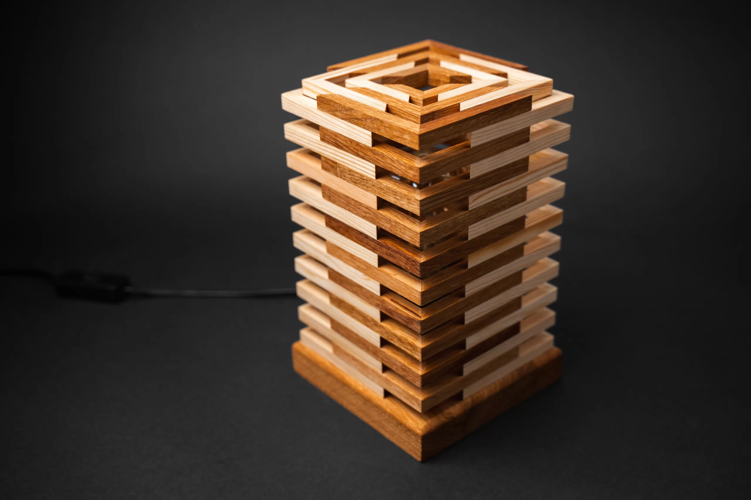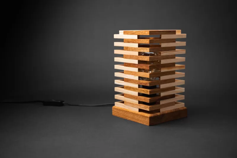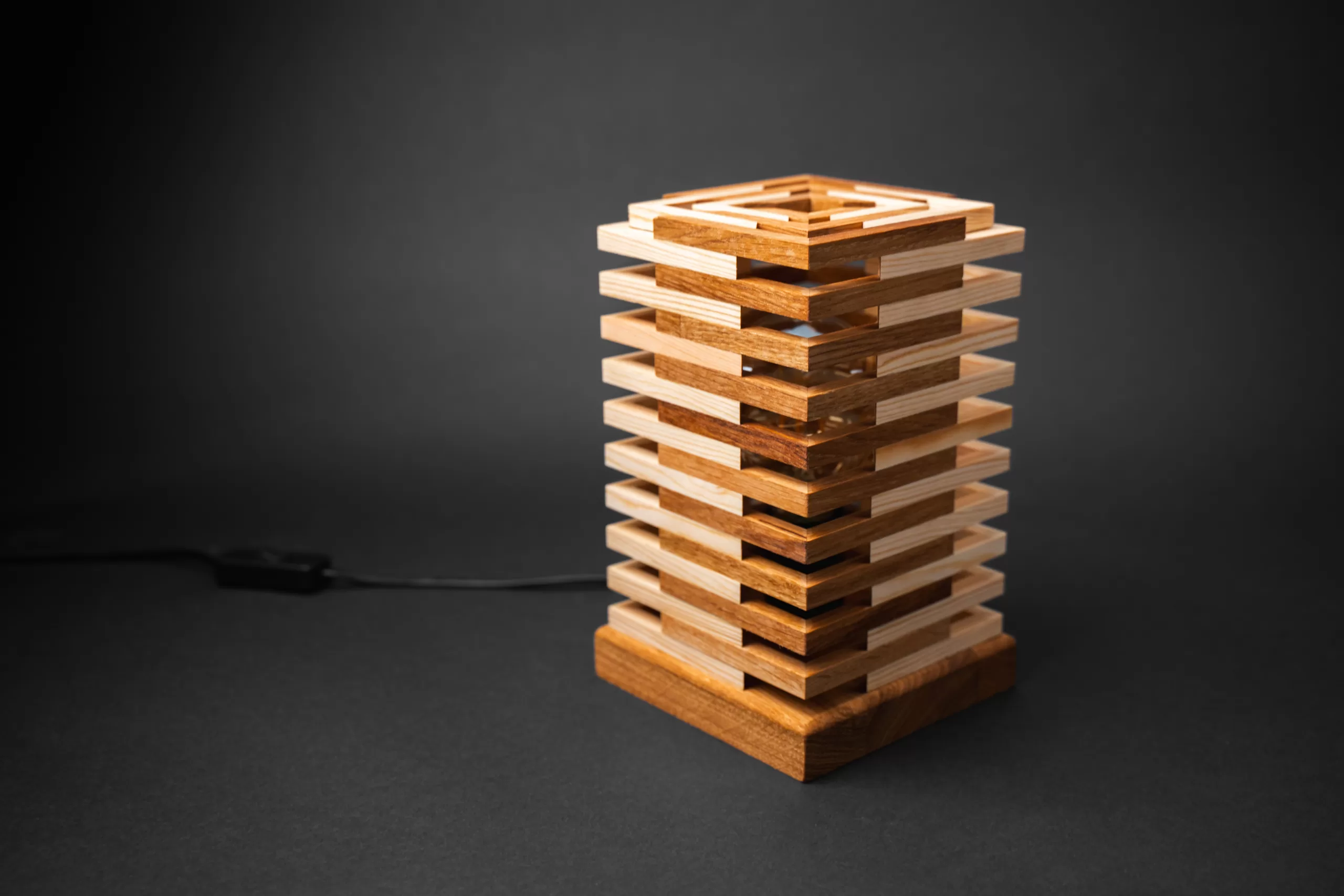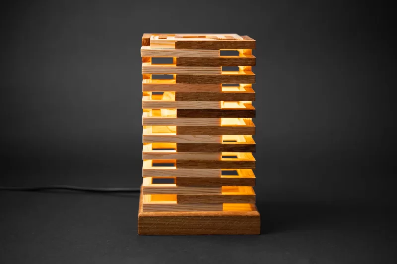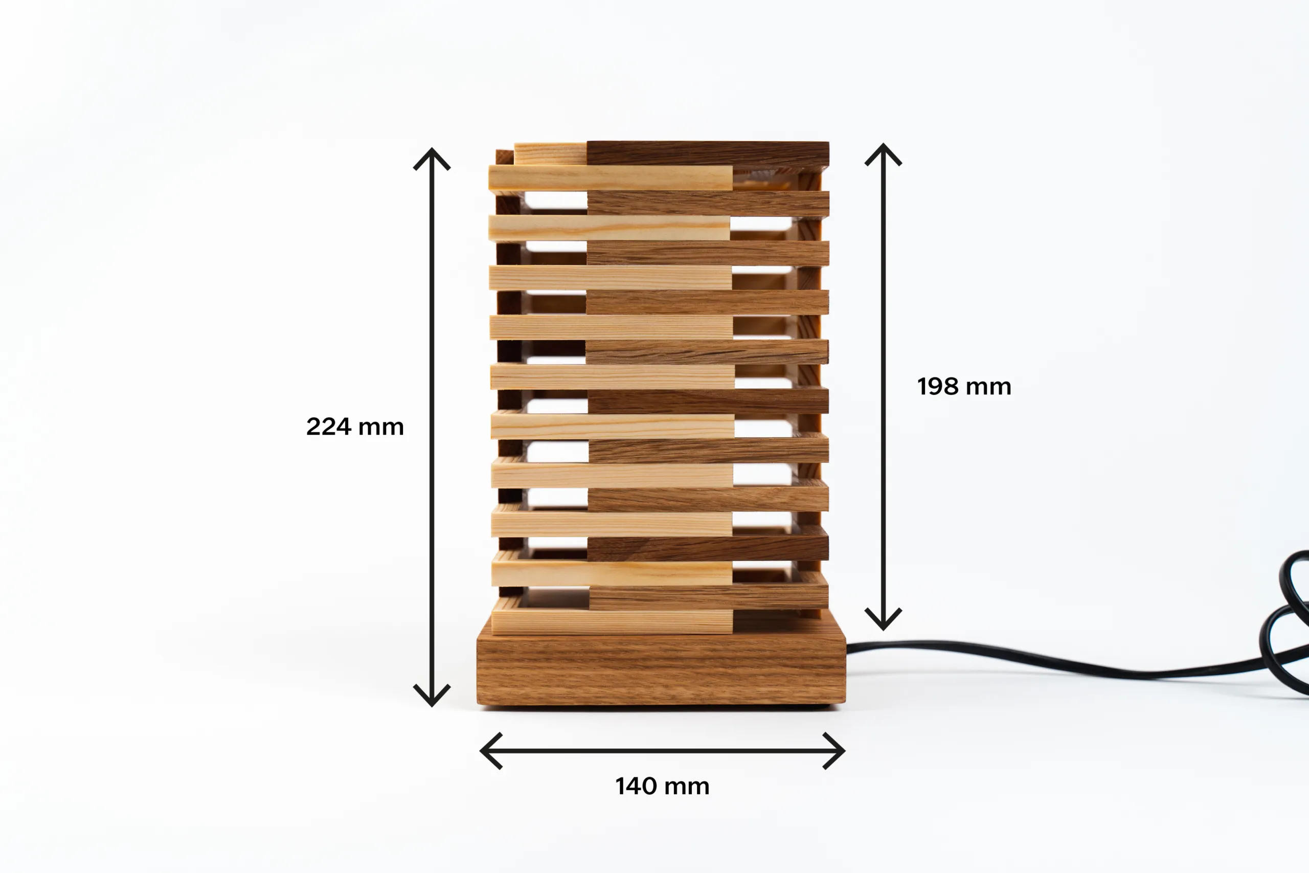 Tria Mur je stolní lampička s osobitým rytmem a přesným tvarem. Kombinace dvou dřev – dubu, javoru nebo smrku – střídajících se po jednotlivých patrech, tvoří pravidelnou čtvercovou věž. Když se rozsvítí, obrys této věže vystoupí ve stínech na stěnách a promění prostor v klidné a soustředěné místo.