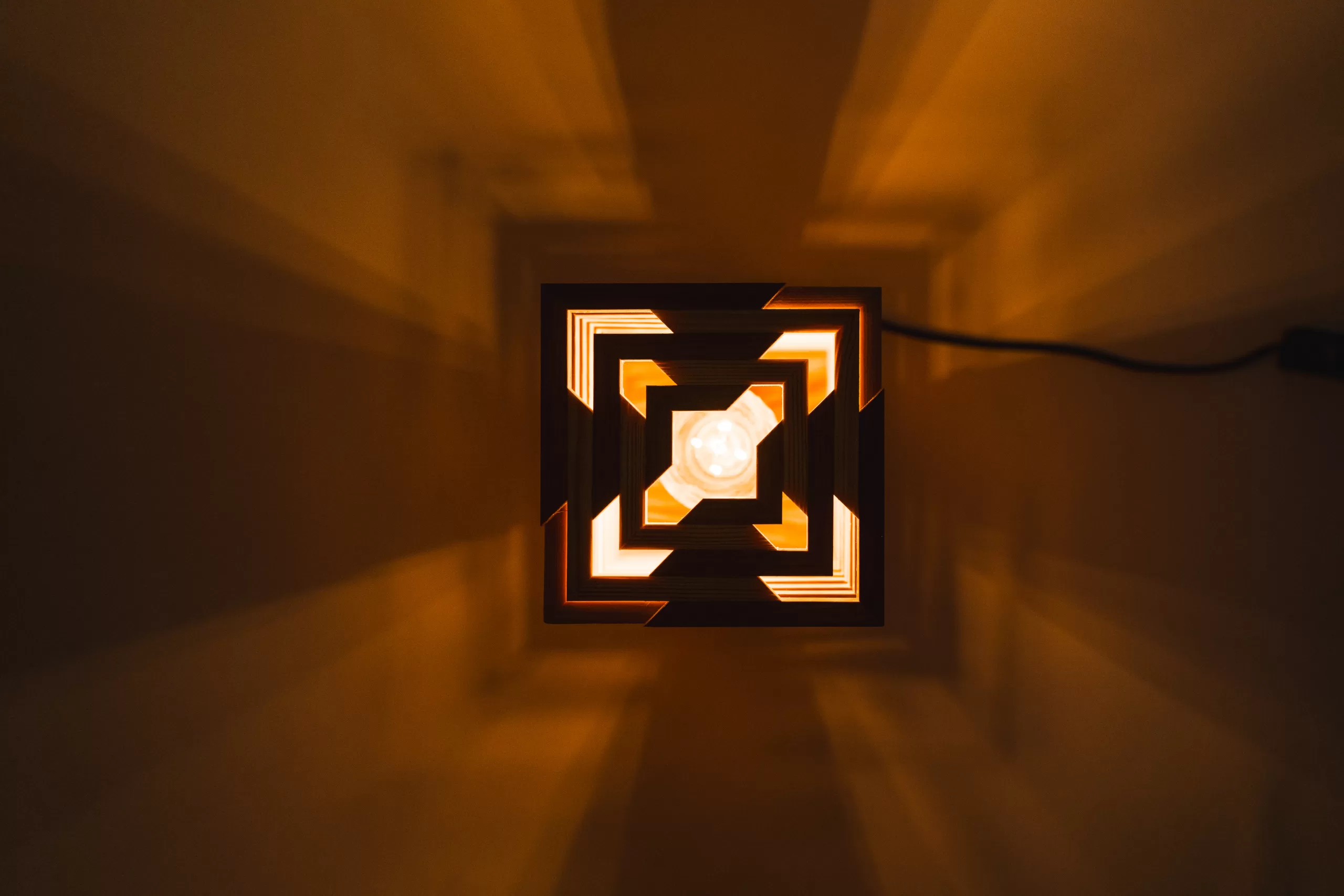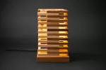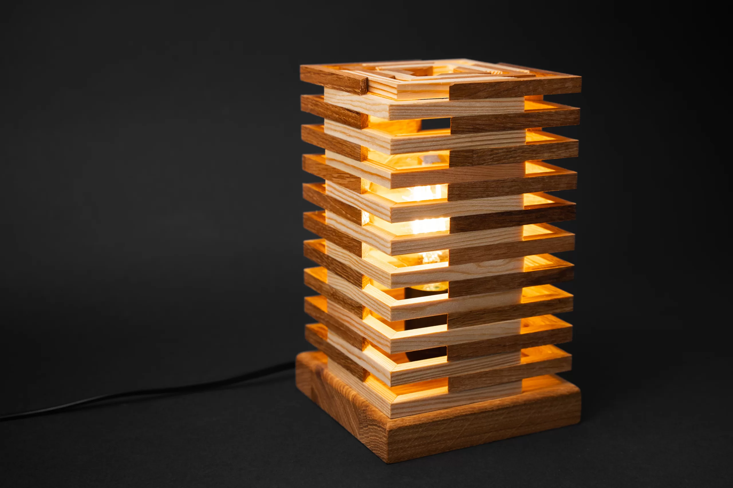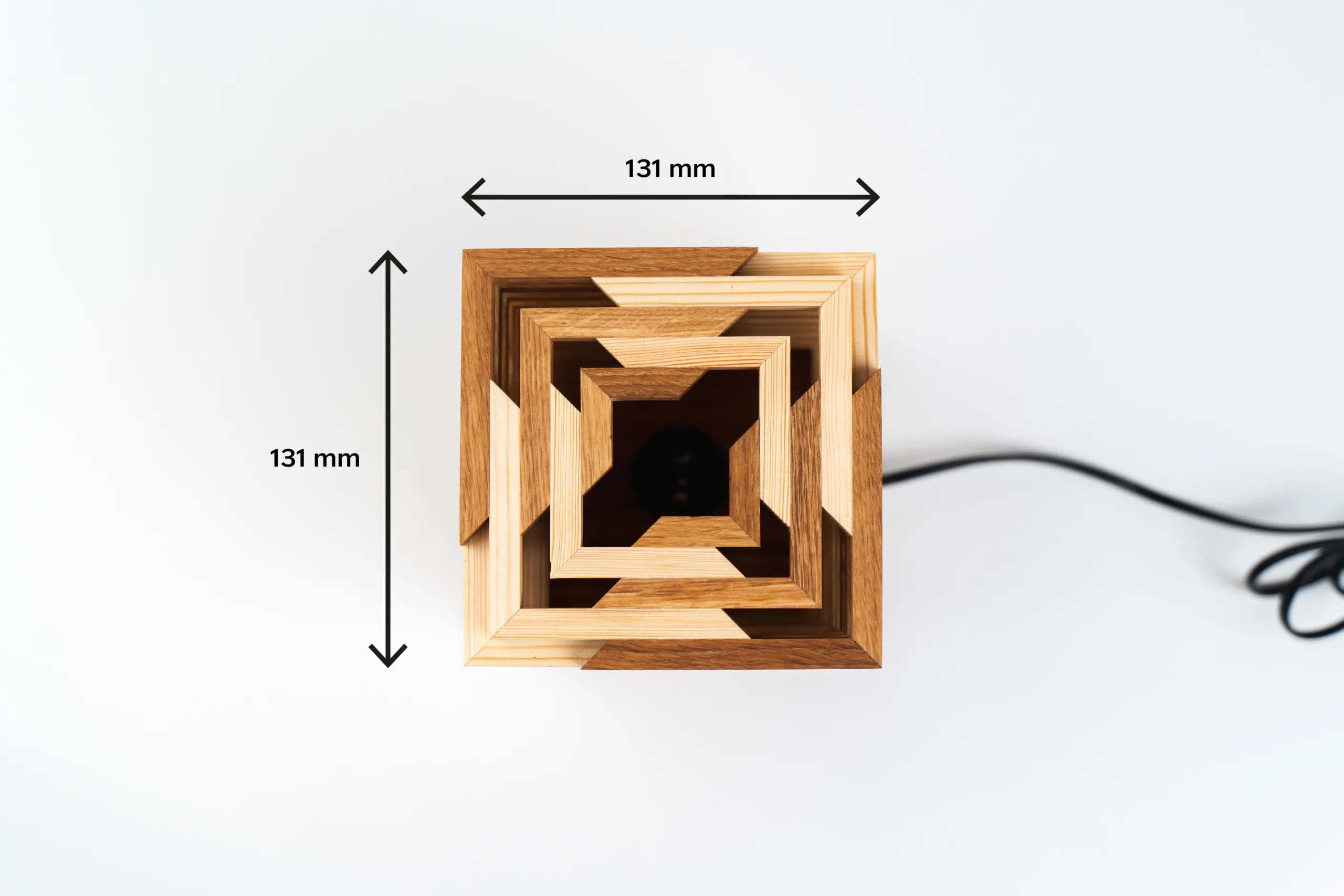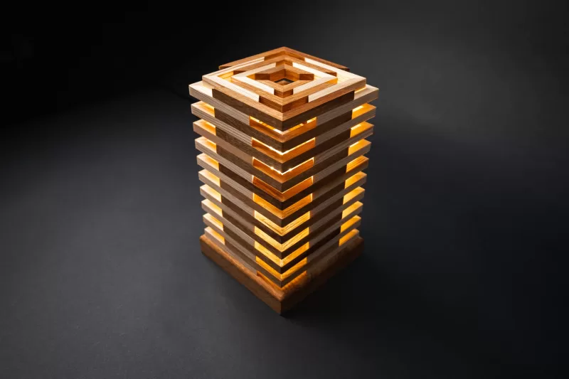 Tria Mur je stolní lampička s osobitým rytmem a přesným tvarem. Kombinace dvou dřev – dubu, javoru nebo smrku – střídajících se po jednotlivých patrech, tvoří pravidelnou čtvercovou věž. Když se rozsvítí, obrys této věže vystoupí ve stínech na stěnách a promění prostor v klidné a soustředěné místo.