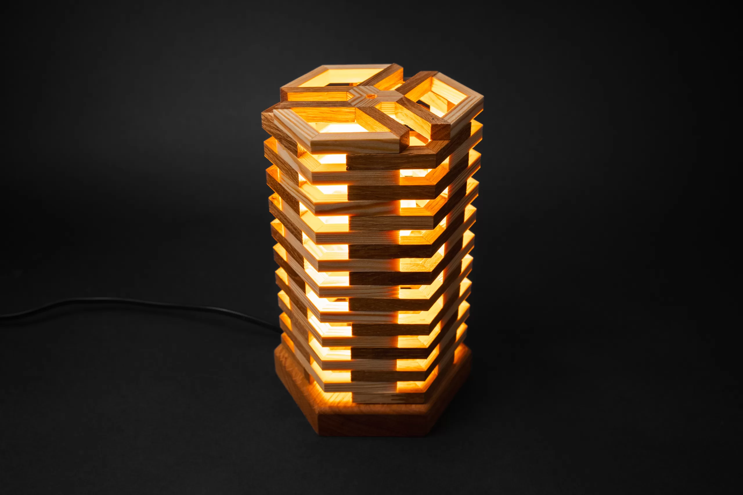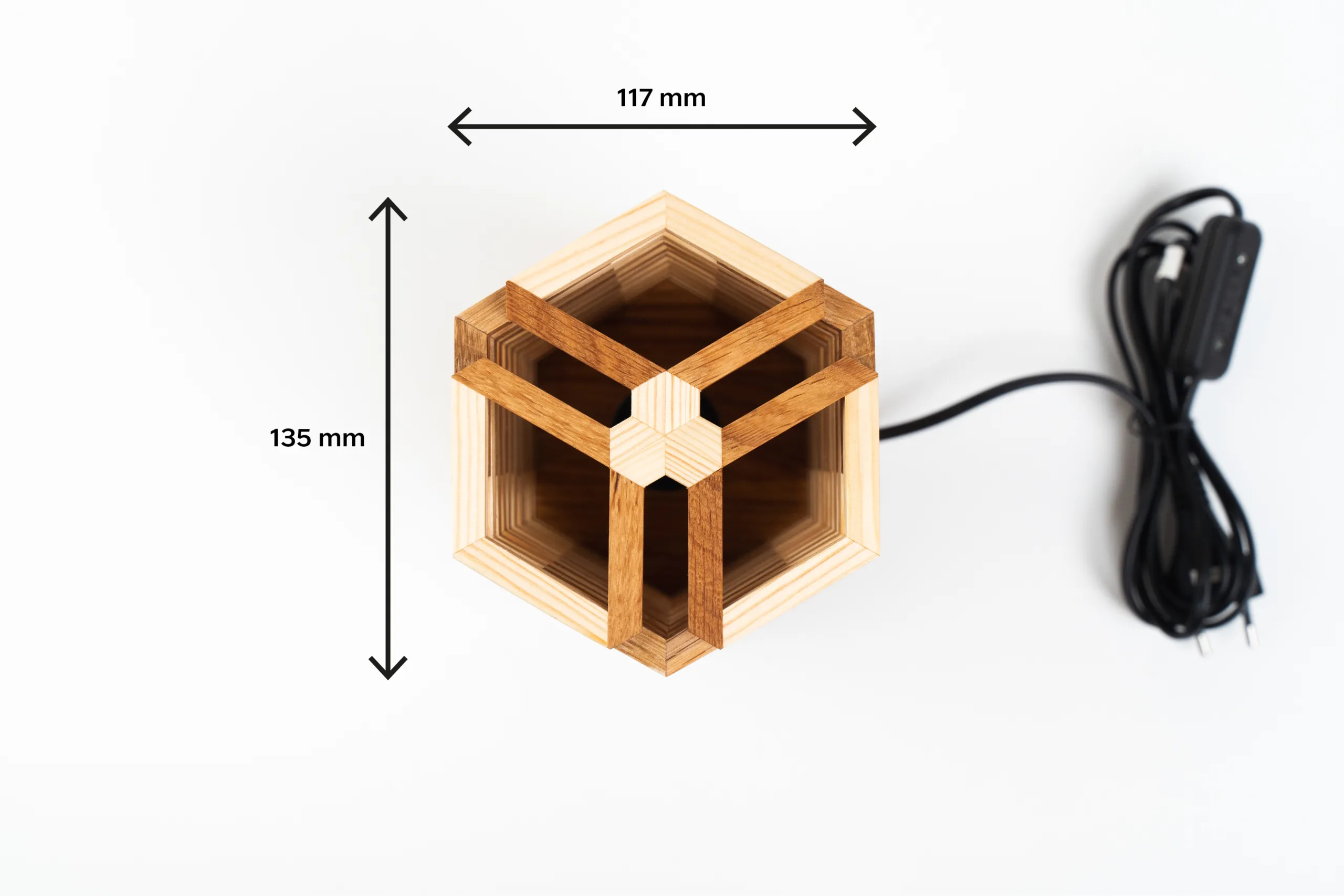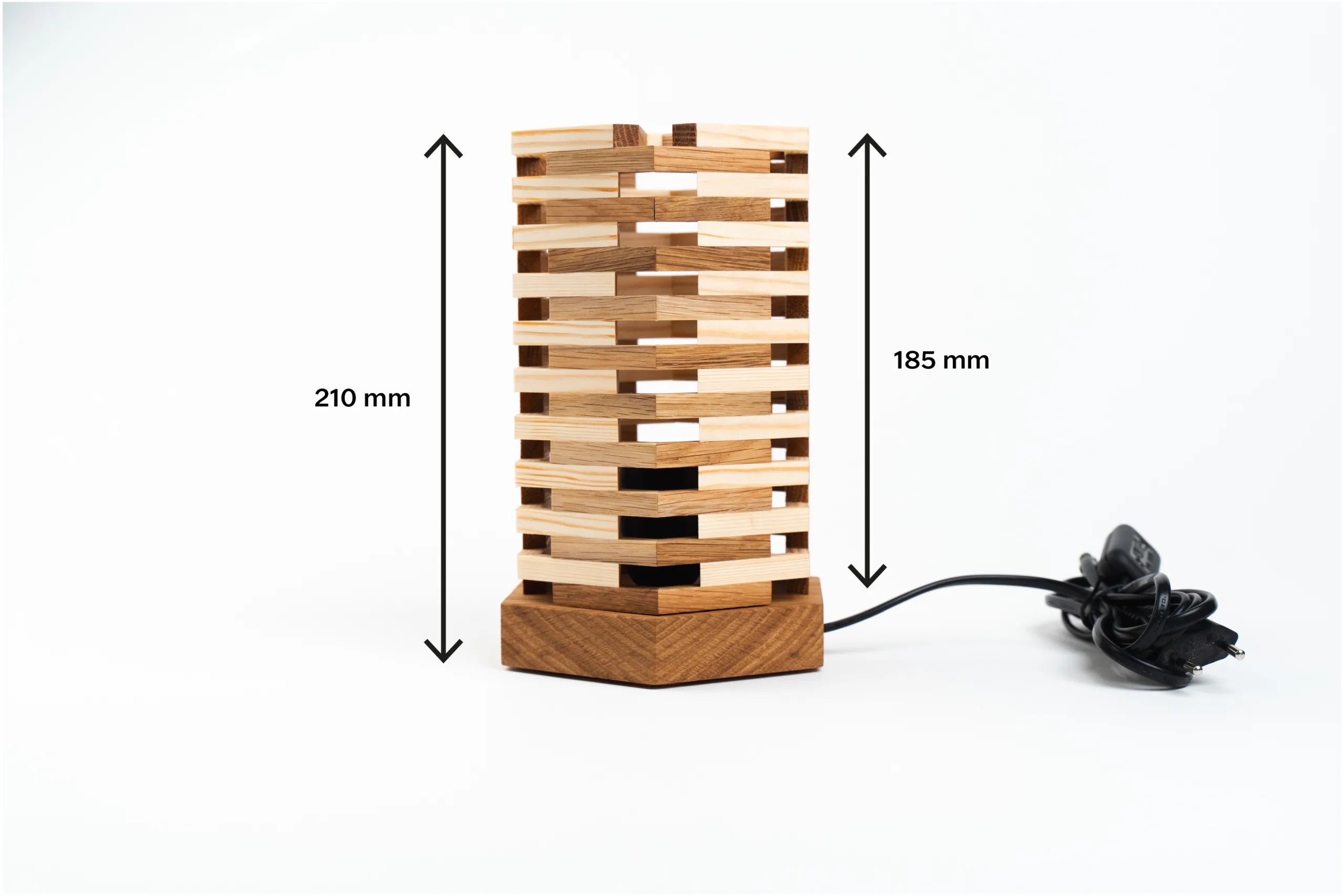 Lampička je vyráběna ručně z dubového dřeva, které je kombinováno se světlejšími tóny smrku nebo javoru. Povrch ošetřený přírodním olejem podtrhuje strukturu a barevnost použitých materiálů. Výsledkem je nadčasový doplněk, který působí esteticky, funkčně i klidně.