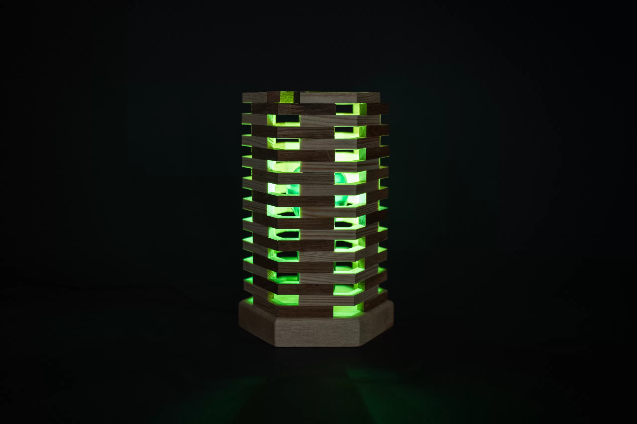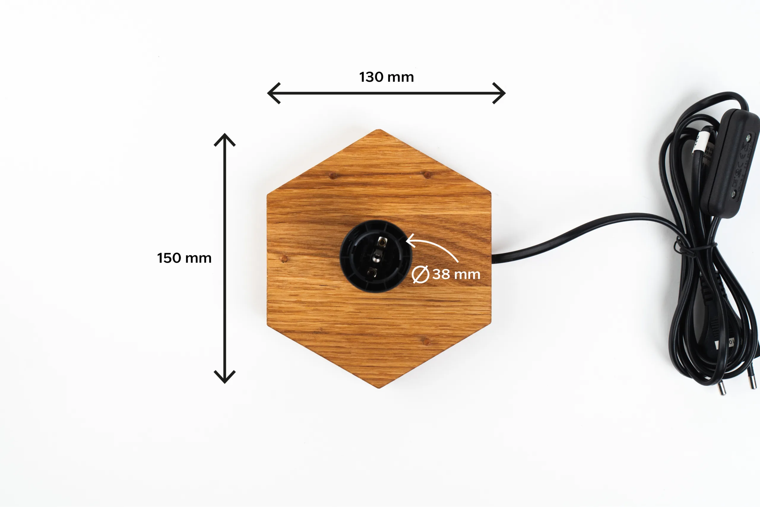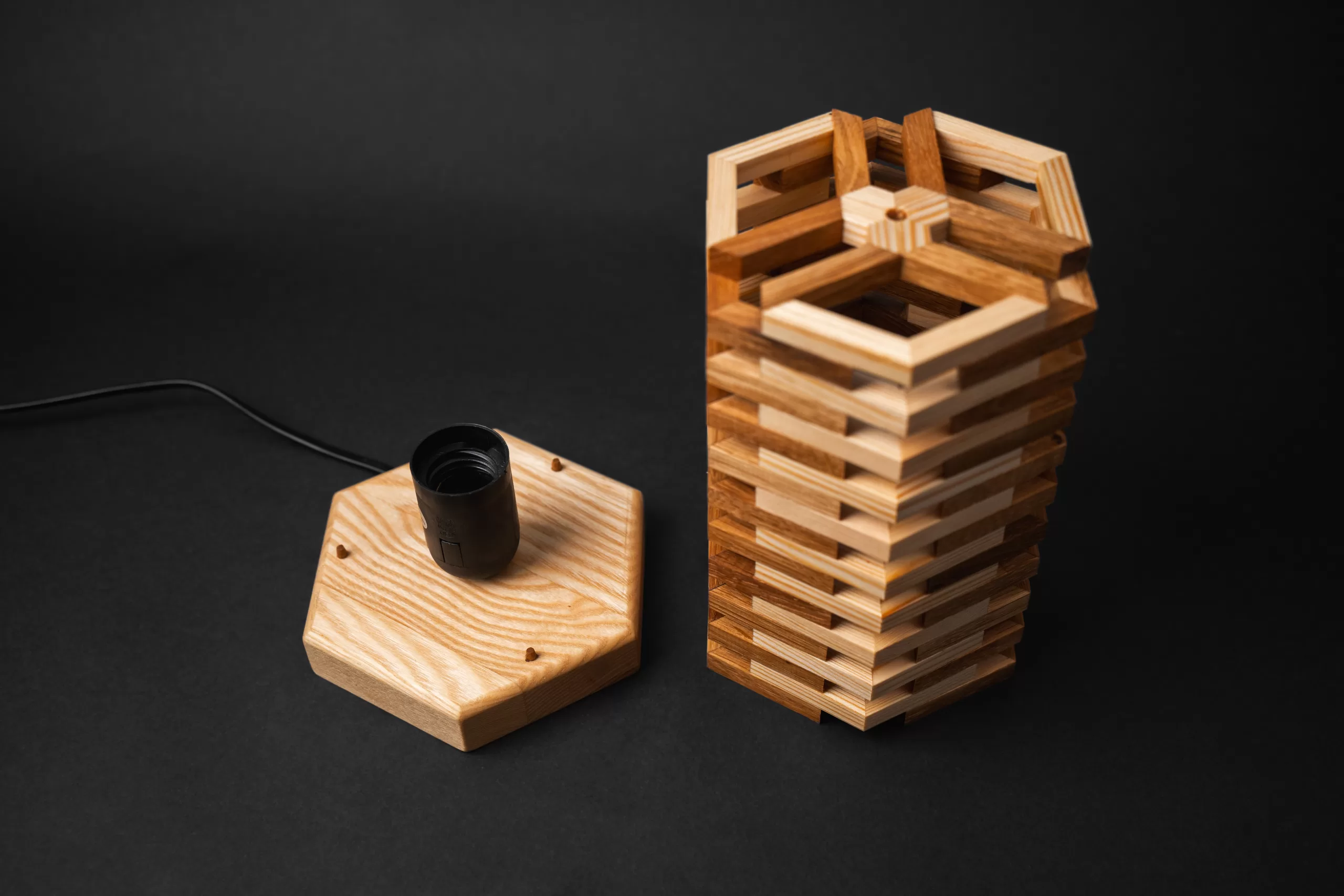 Lampička je vyráběna ručně z dubového dřeva, které je kombinováno se světlejšími tóny smrku nebo javoru. Povrch ošetřený přírodním olejem podtrhuje strukturu a barevnost použitých materiálů. Výsledkem je nadčasový doplněk, který působí esteticky, funkčně i klidně.