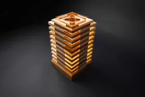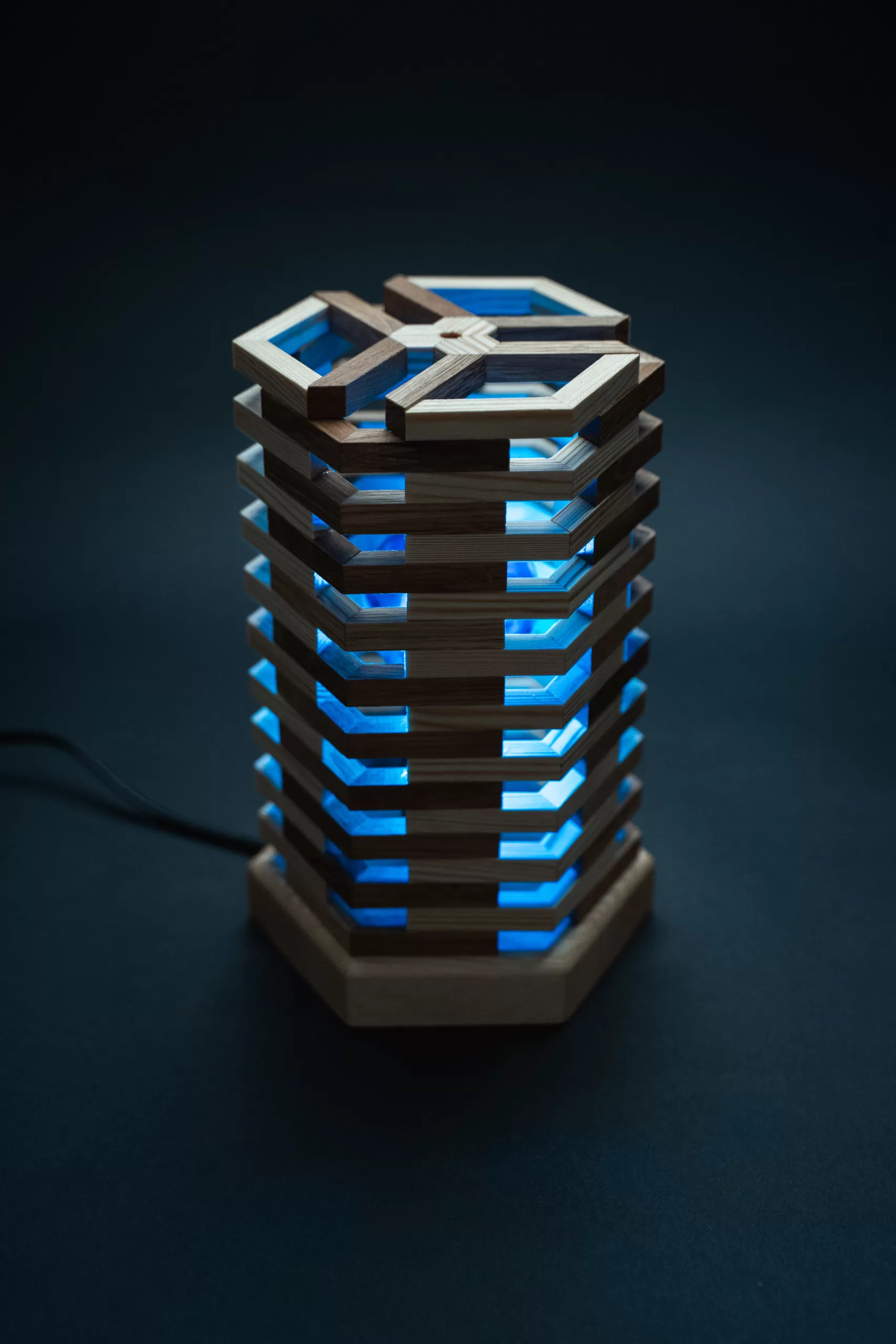 Tria Cuni je stolní lampička, která propojuje přesnou geometrii s organickou přirozeností dřeva. Její design je založený na střídavém vrstvení dřevěných lamel v pravidelném rytmu, který připomíná dřevěný dech – klidný, pravidelný, přirozený.