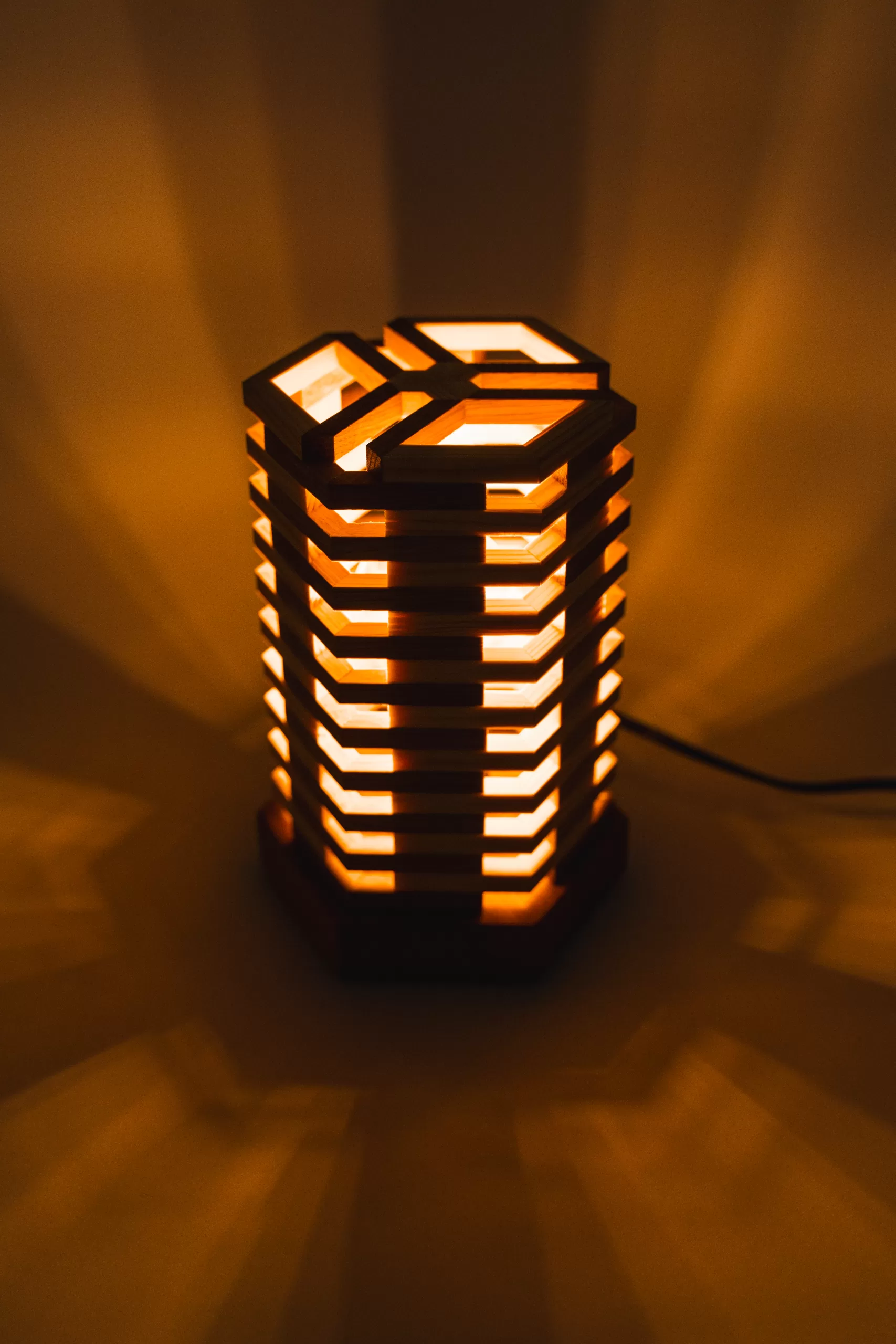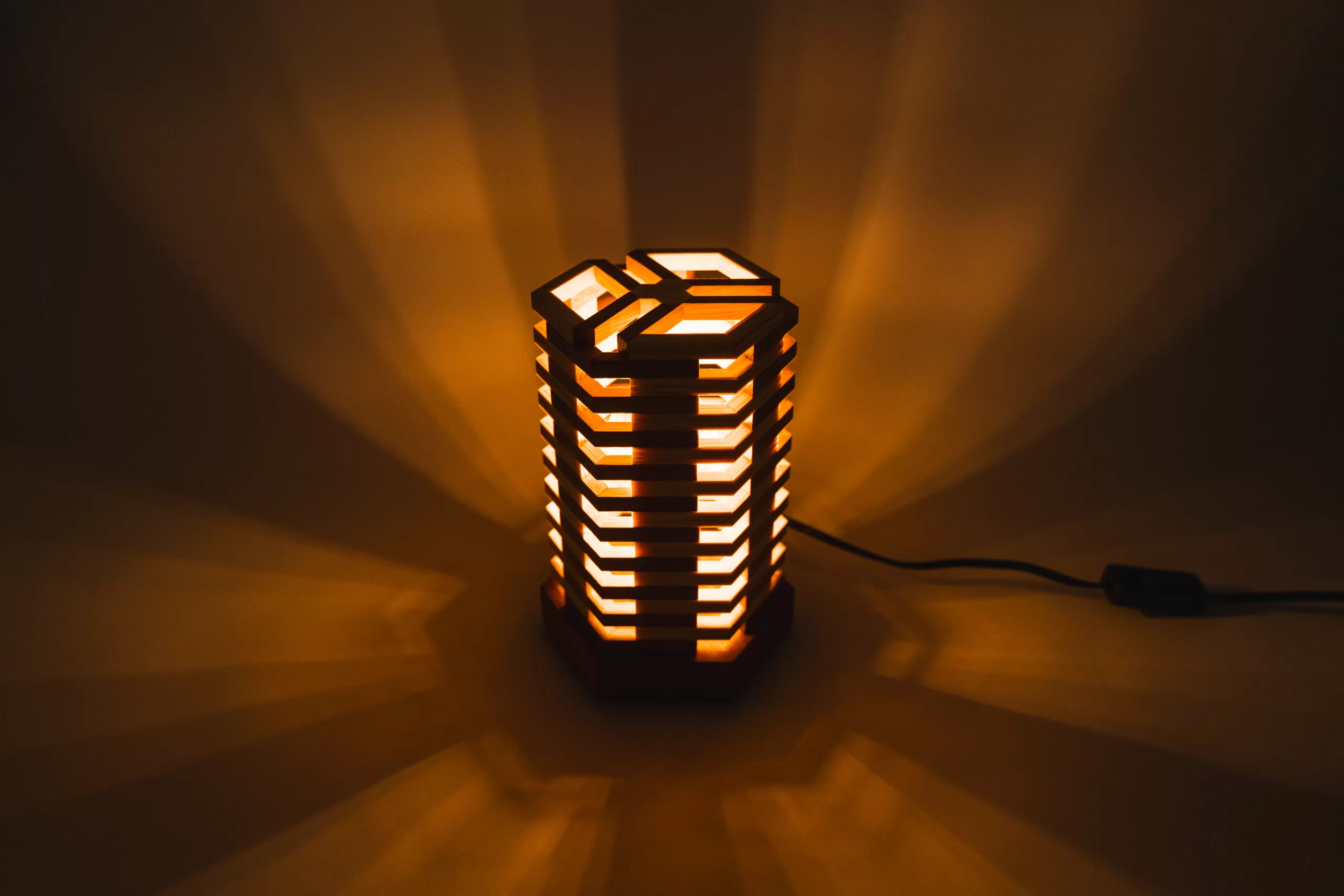 Vnější tvar lampičky tvoří plynule se zužující věž připomínající starou lucernu nebo totem – objekt, který v sobě nese světlo, vzpomínky i příběhy. Díky pravidelné konstrukci vzniká kolem lampičky jedinečná stínohra, která rozvibrovává prostor a přináší do něj harmonii.