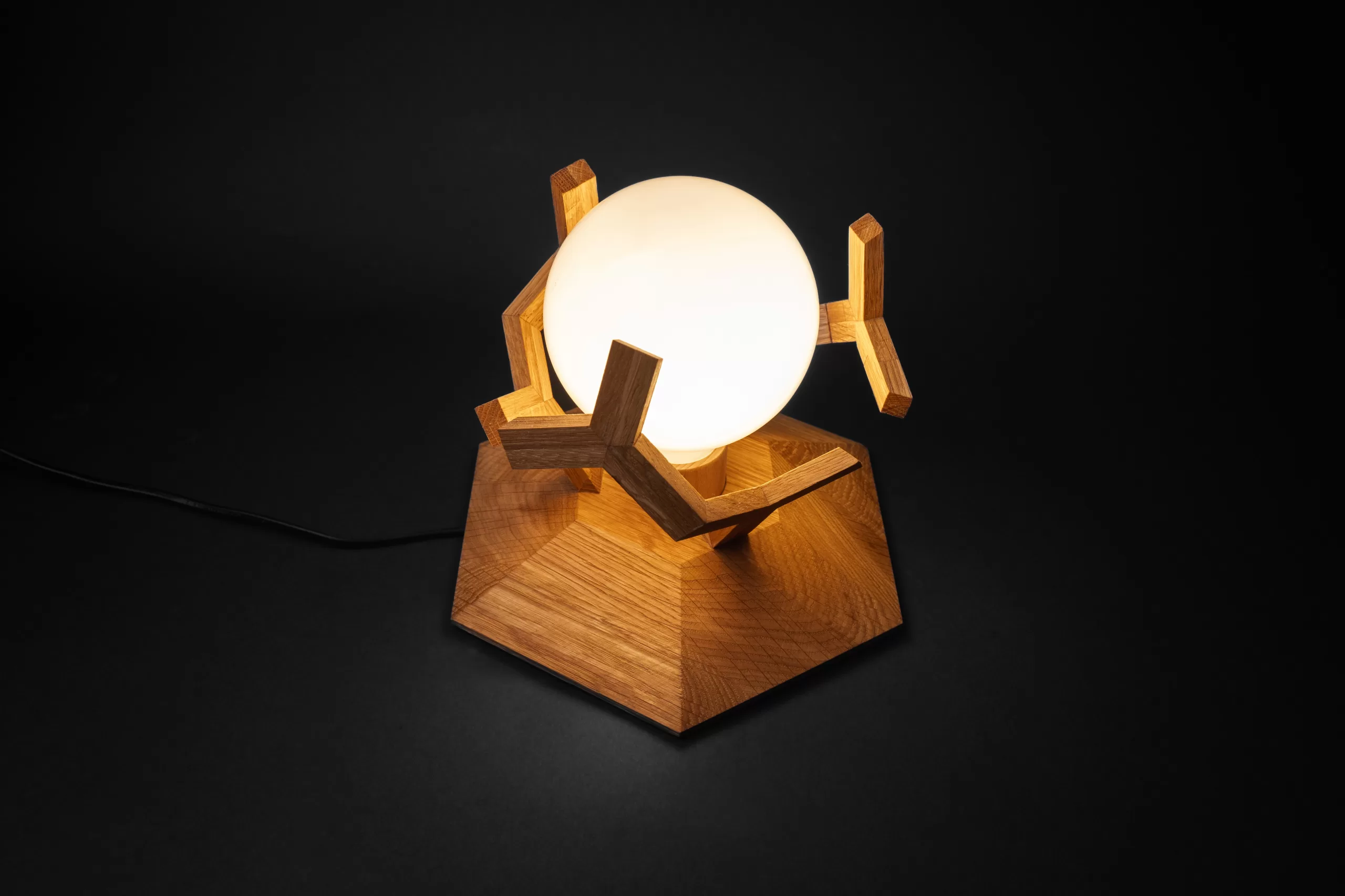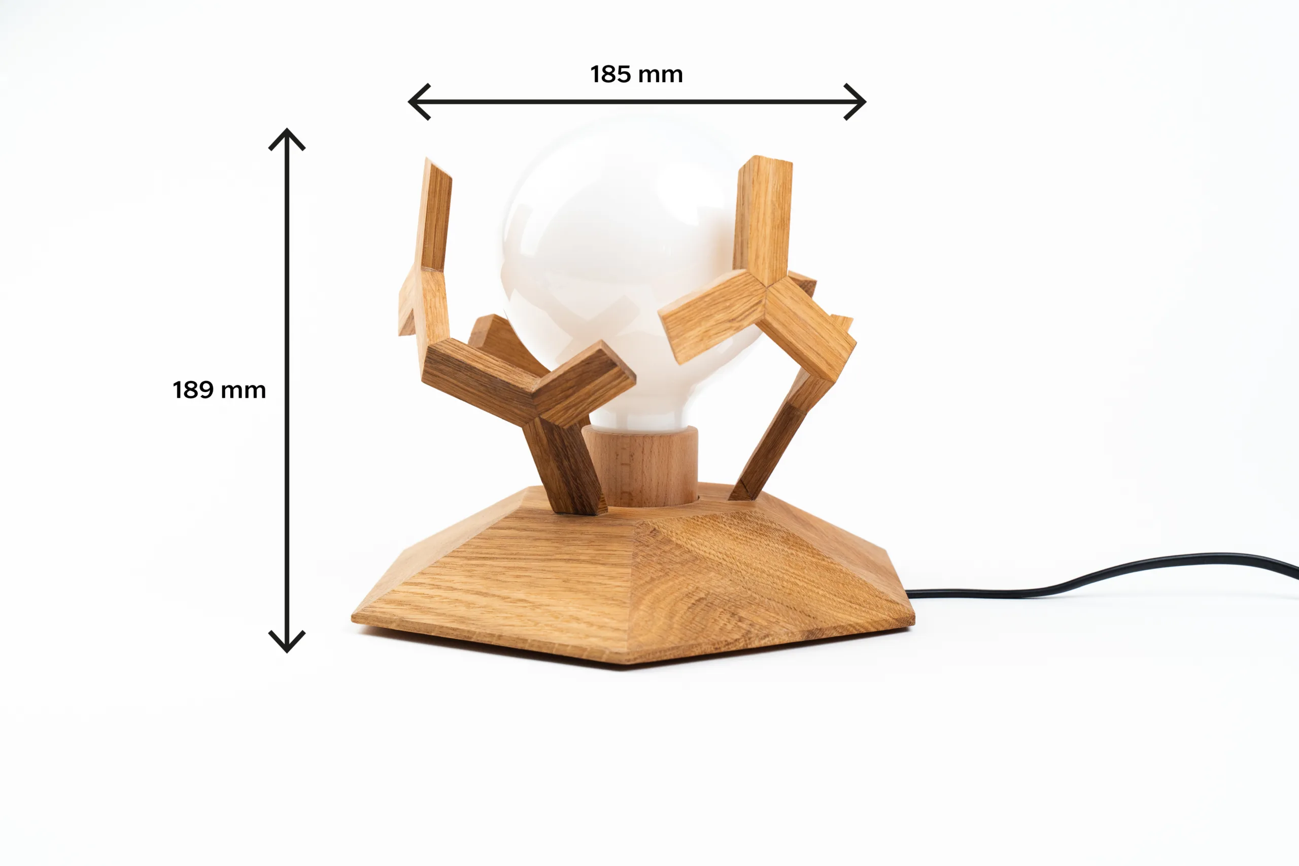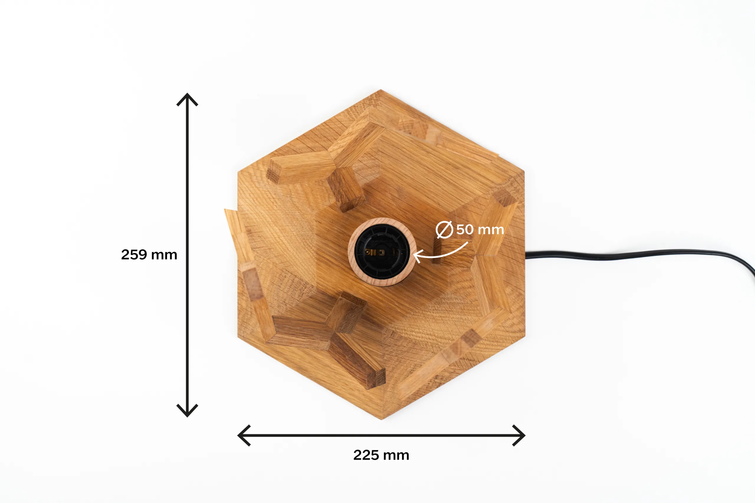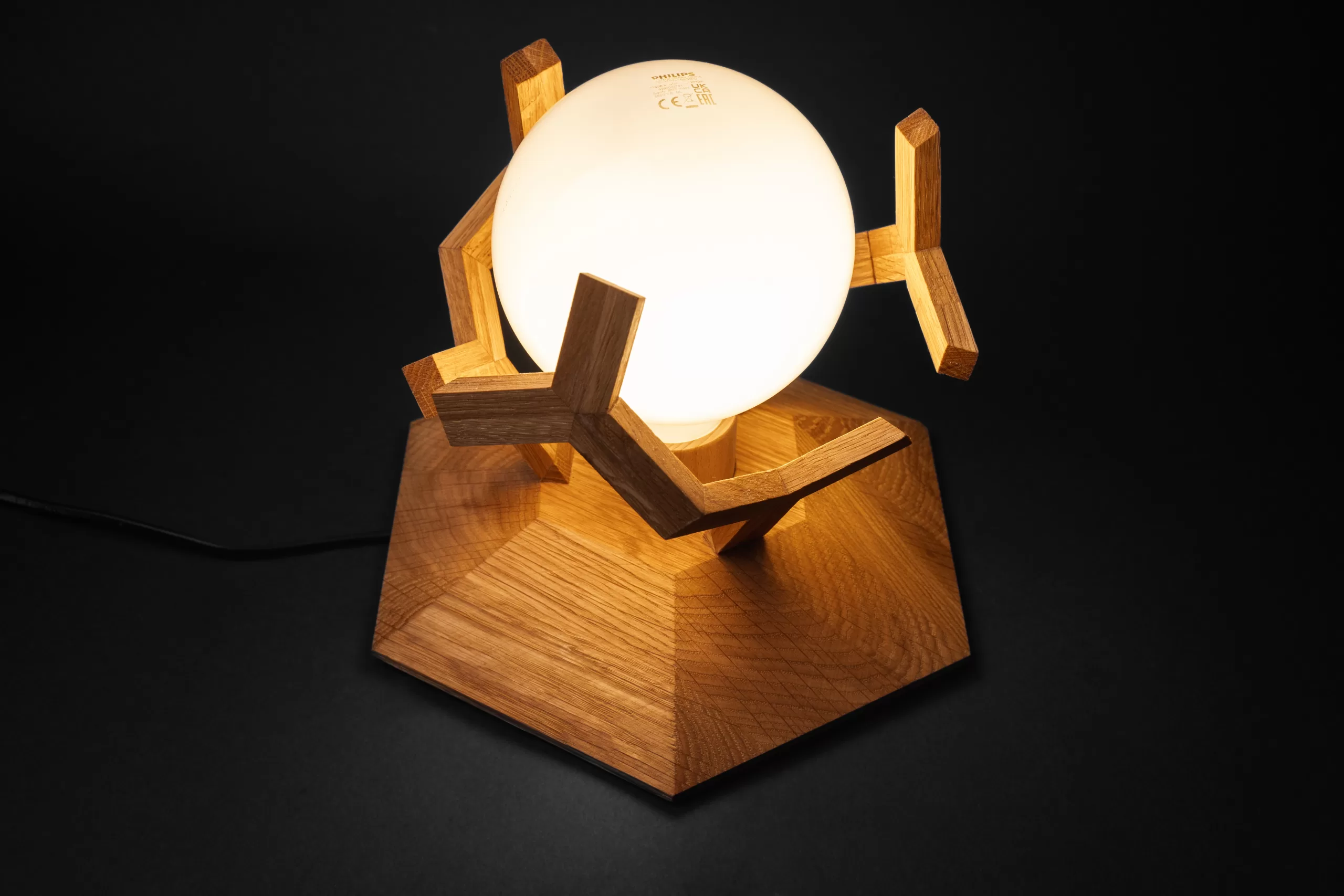 Stolní lampička Tria Sol představuje spojení elegantního designu s přírodními prvky, které oživí váš domov a vytvoří nezapomenutelnou atmosféru. Její podstavec ve tvaru šestiúhelníku z masivního dubového dřeva postupně stoupá směrem k centru, a s velkou kulatou žárovkou na klasickou objímku, připomínající slunce, se stává centrem pozornosti v místnosti.