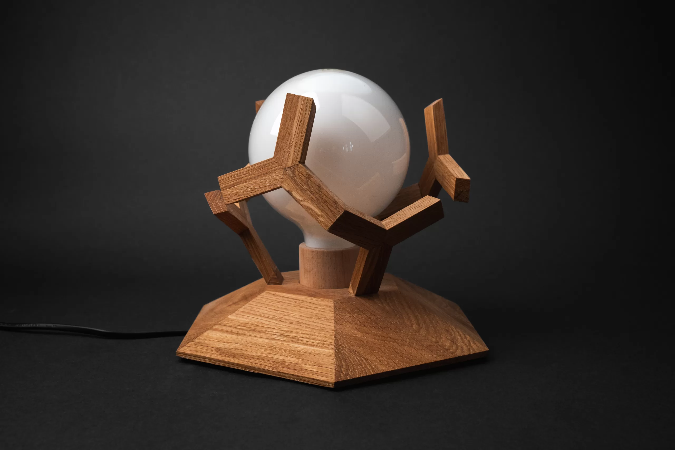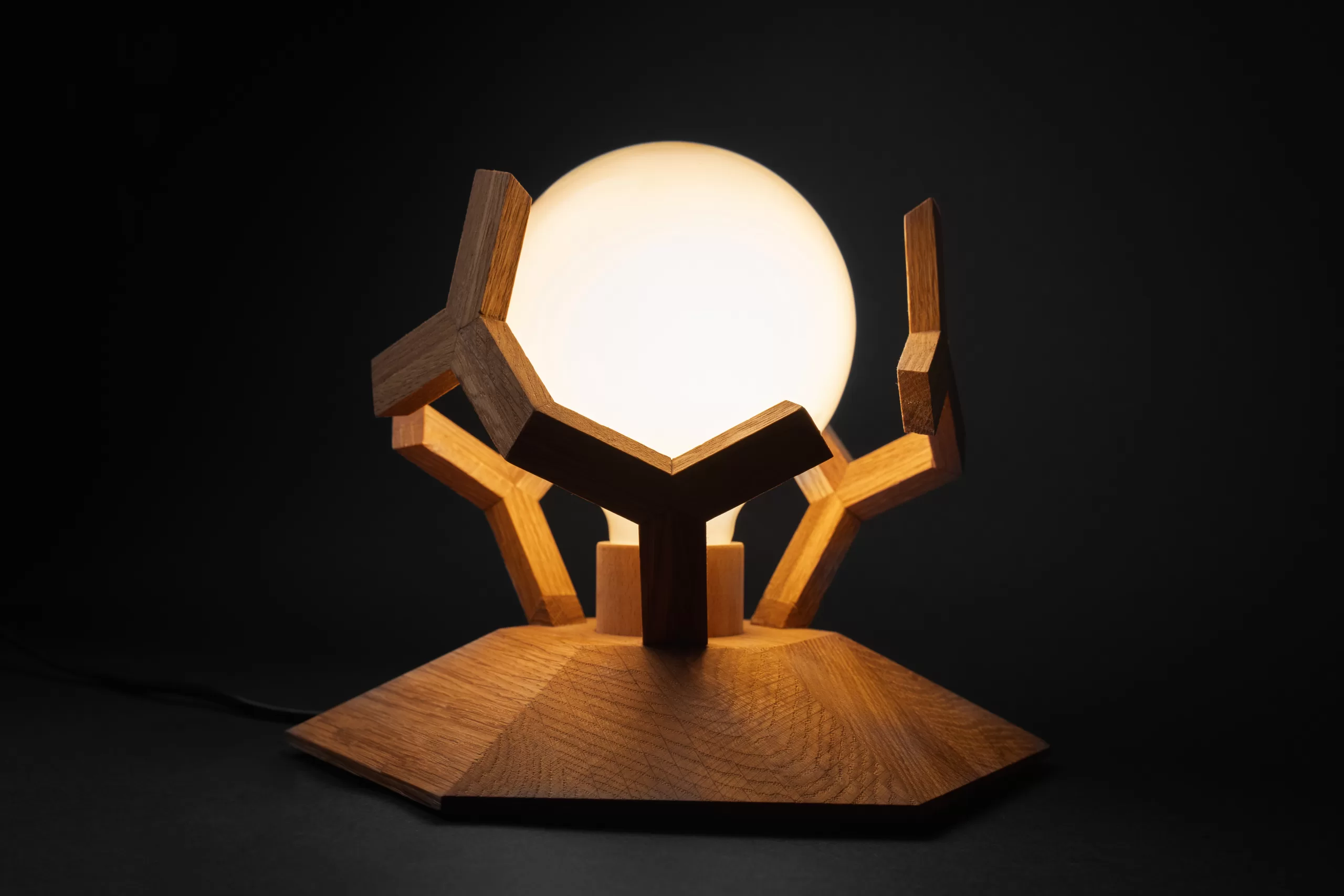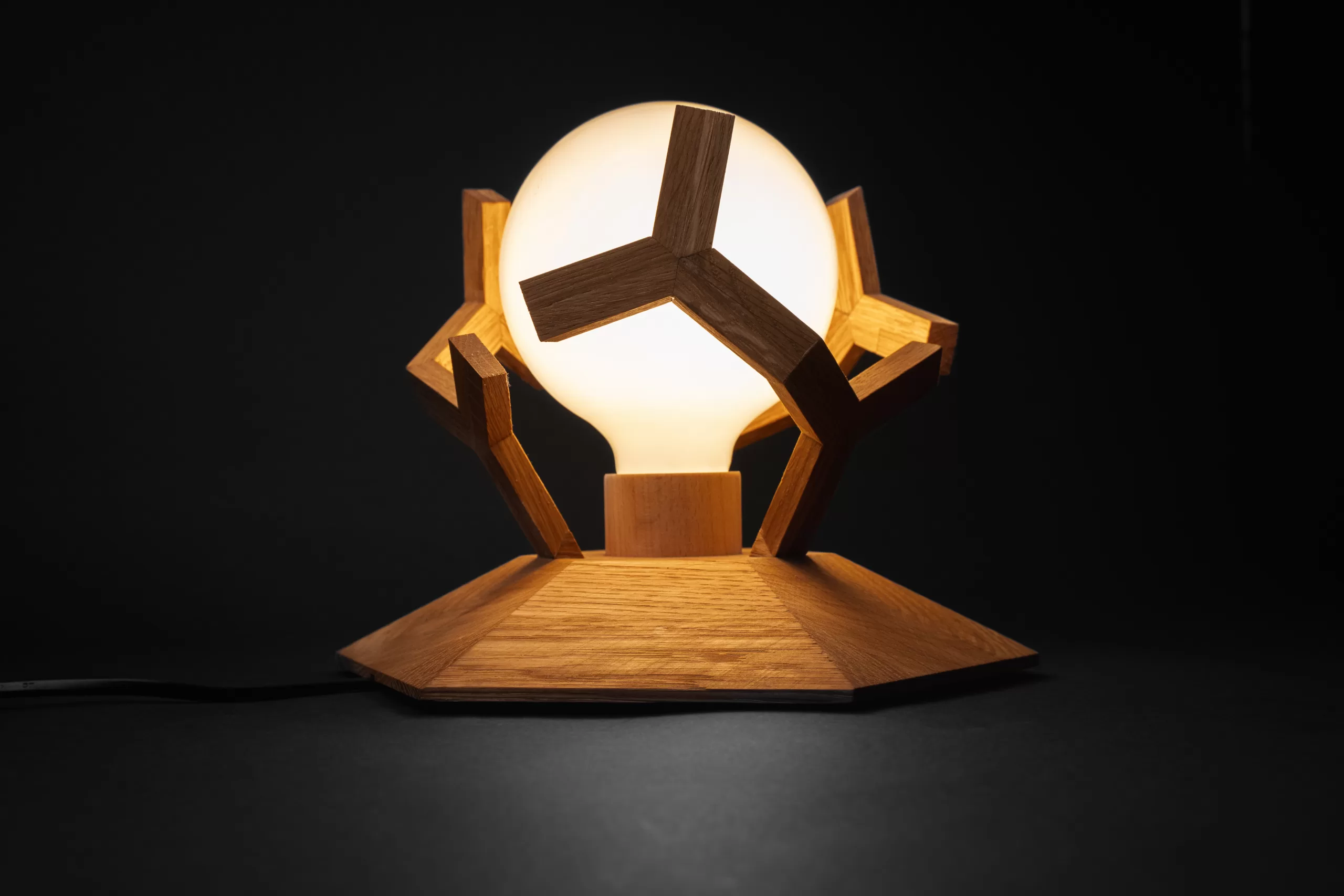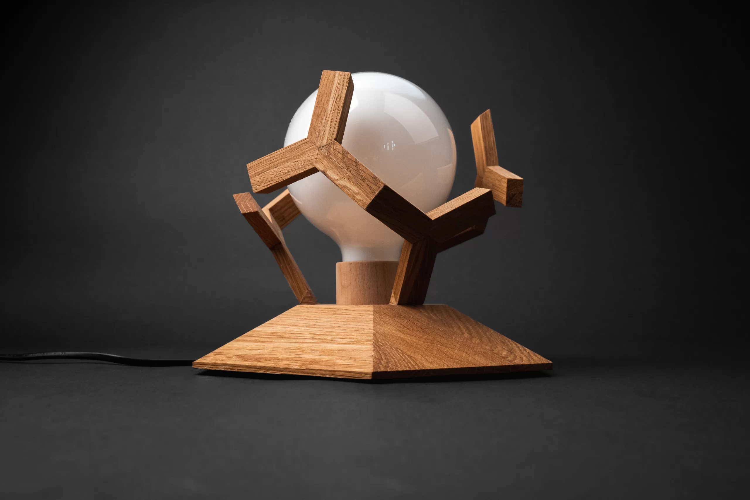 Stolní lampička Tria Sol představuje spojení elegantního designu s přírodními prvky, které oživí váš domov a vytvoří nezapomenutelnou atmosféru. Její podstavec ve tvaru šestiúhelníku z masivního dubového dřeva postupně stoupá směrem k centru, a s velkou kulatou žárovkou na klasickou objímku, připomínající slunce, se stává centrem pozornosti v místnosti.
