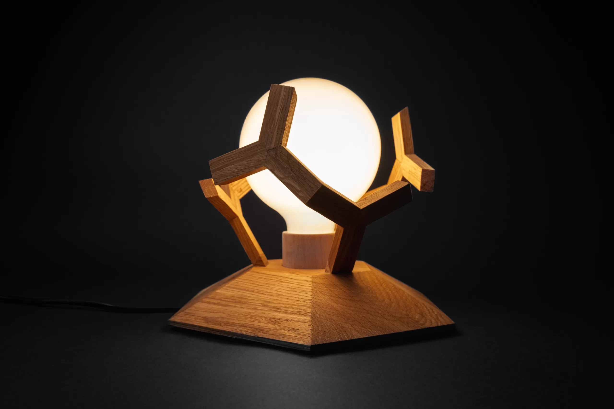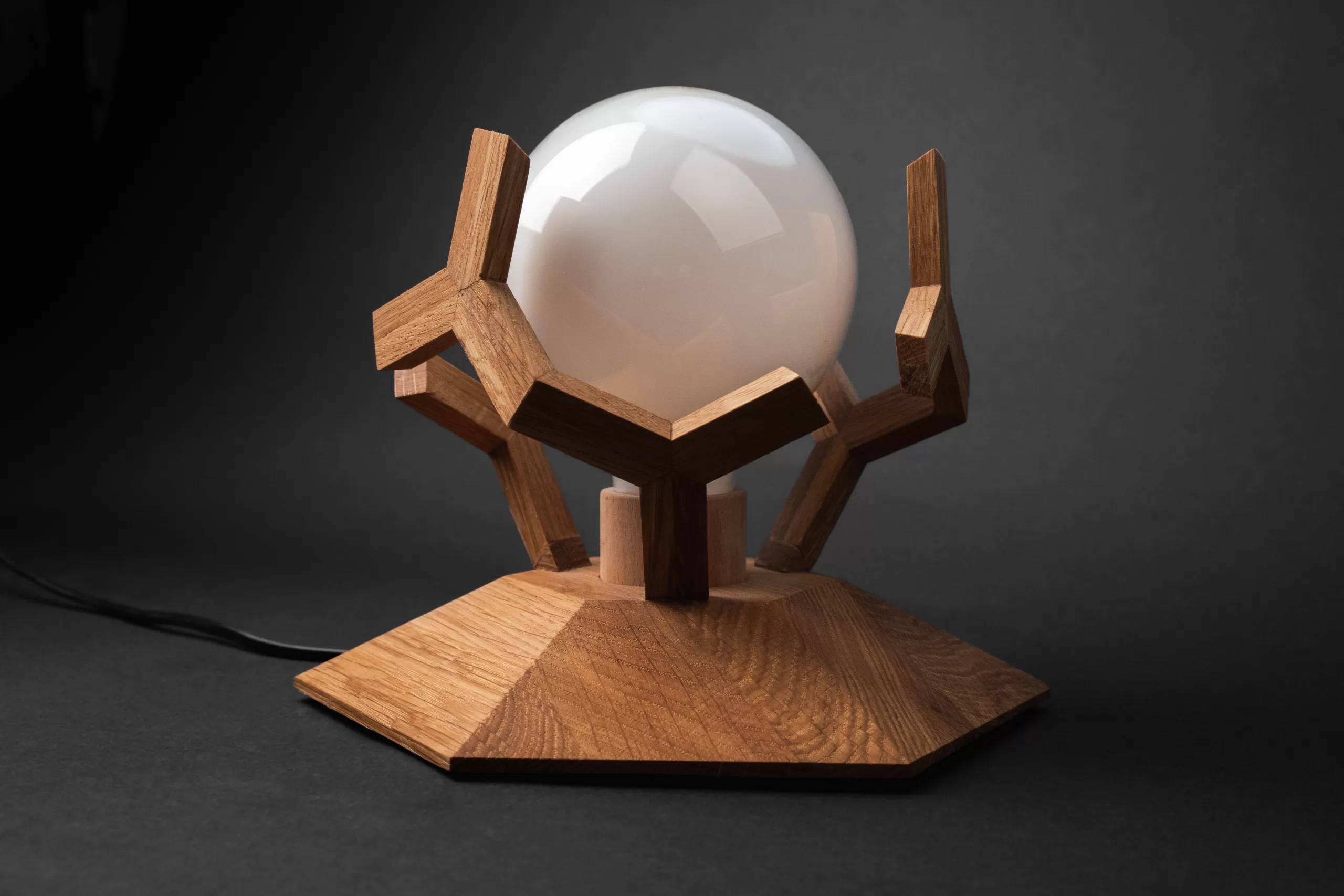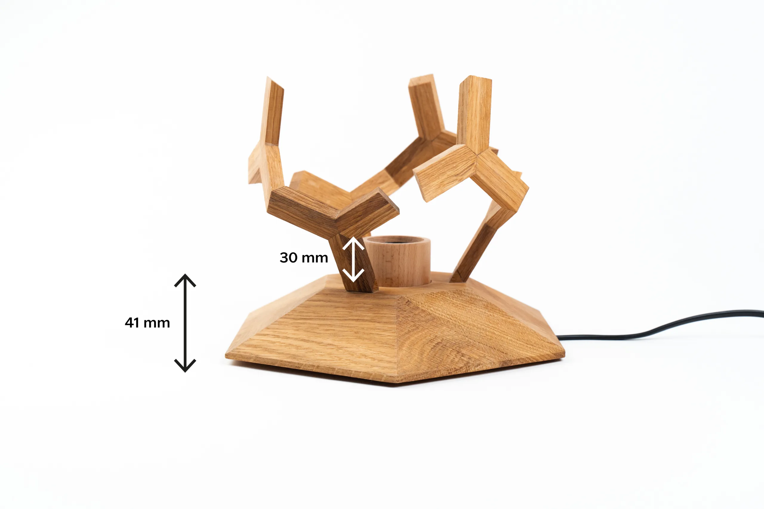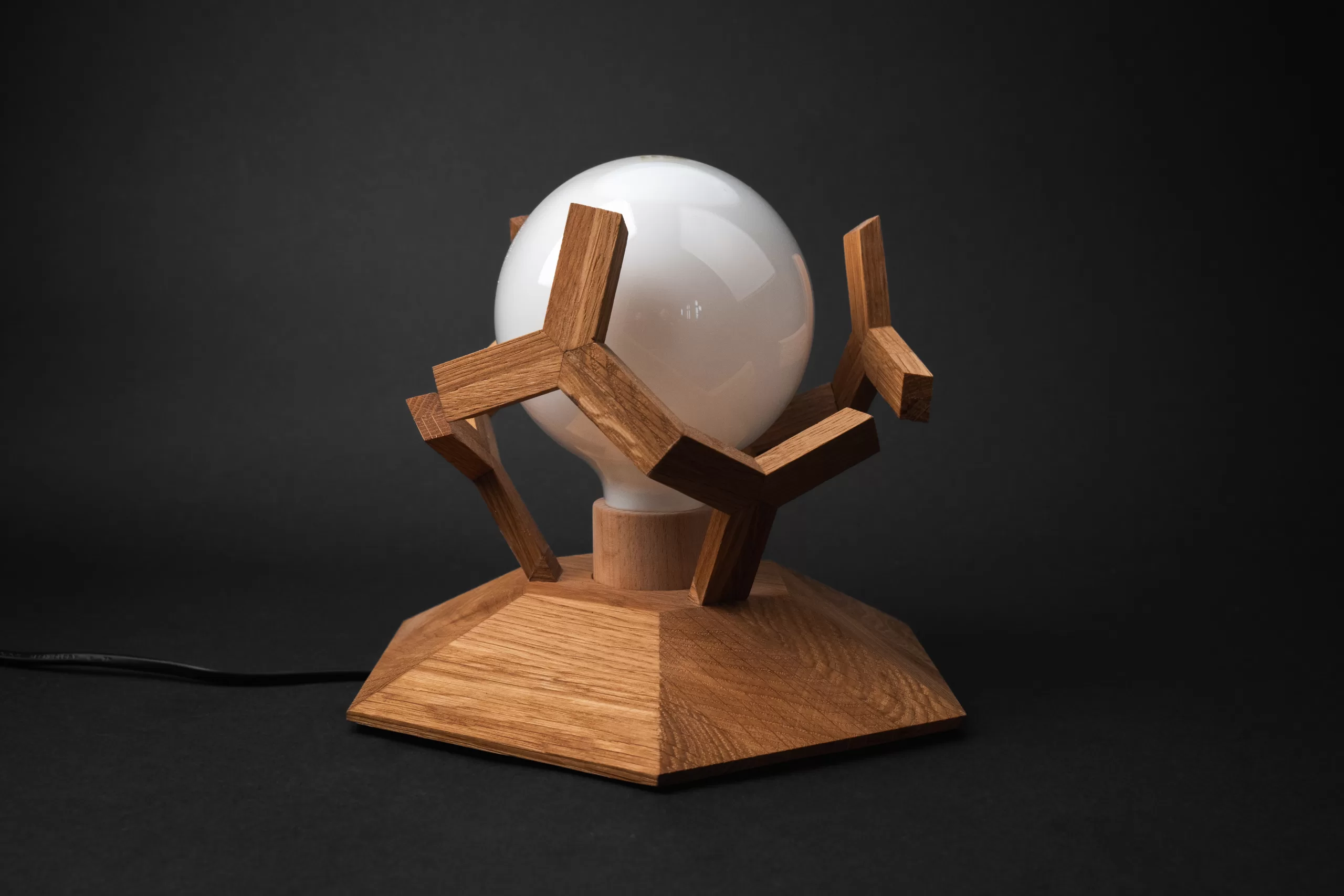 Stolní lampička Tria Sol představuje spojení elegantního designu s přírodními prvky, které oživí váš domov a vytvoří nezapomenutelnou atmosféru. Její podstavec ve tvaru šestiúhelníku z masivního dubového dřeva postupně stoupá směrem k centru, a s velkou kulatou žárovkou na klasickou objímku, připomínající slunce, se stává centrem pozornosti v místnosti.