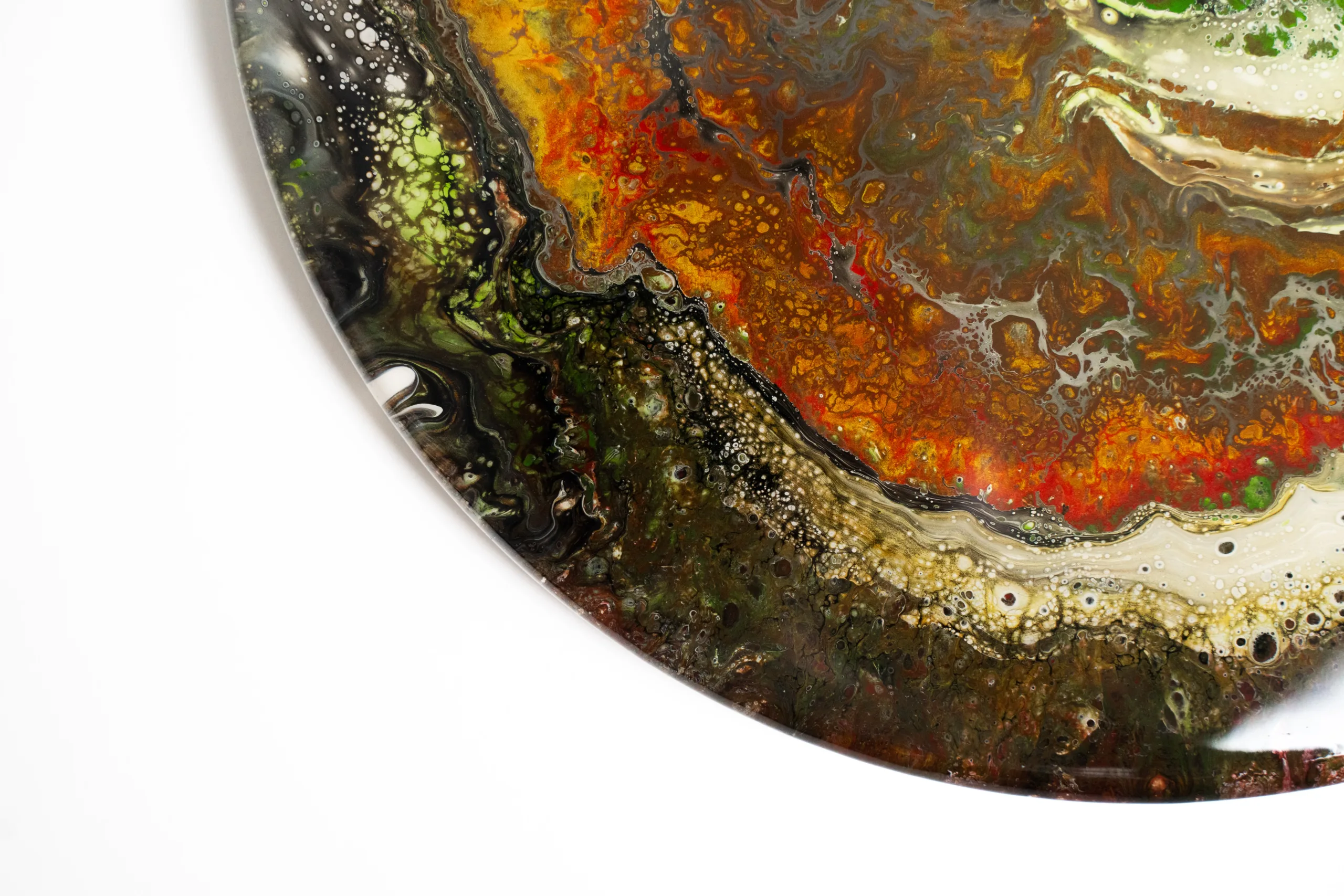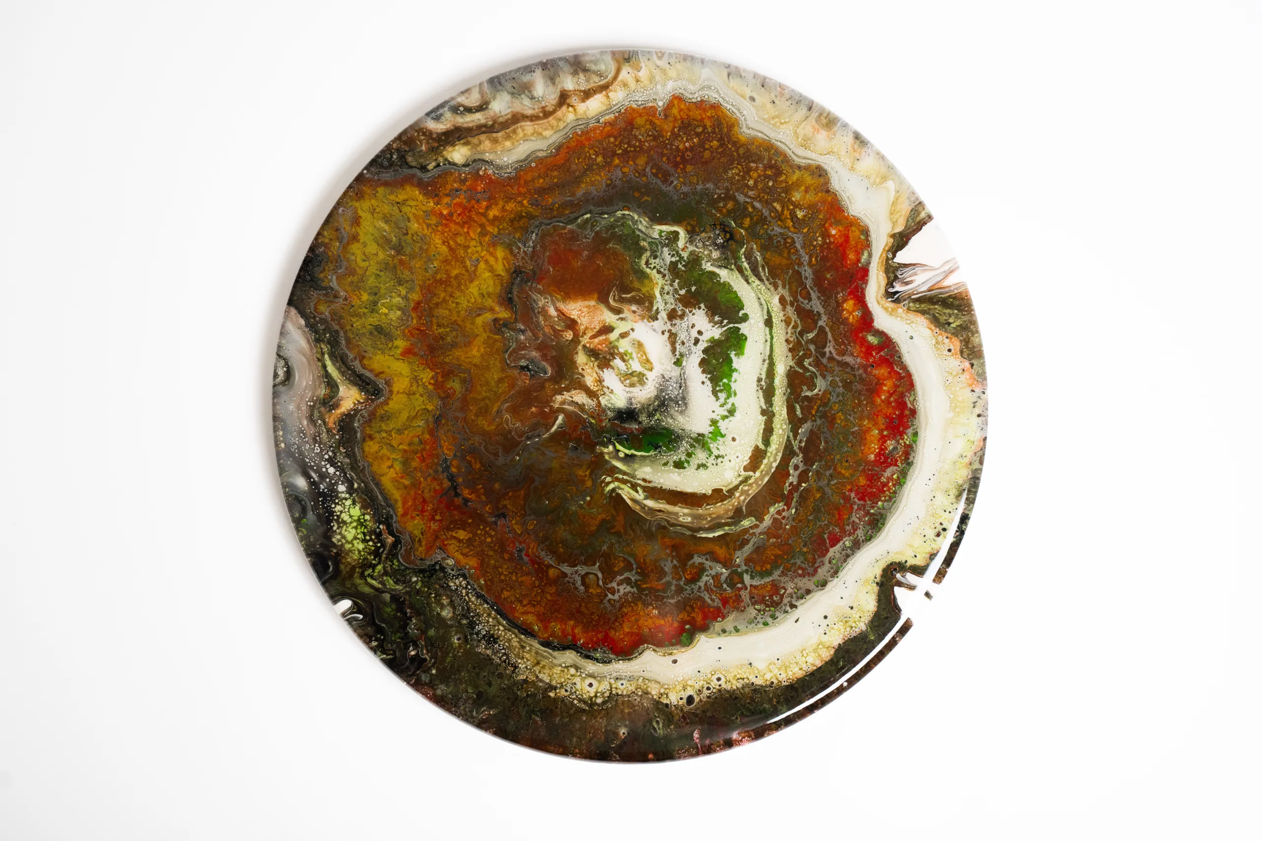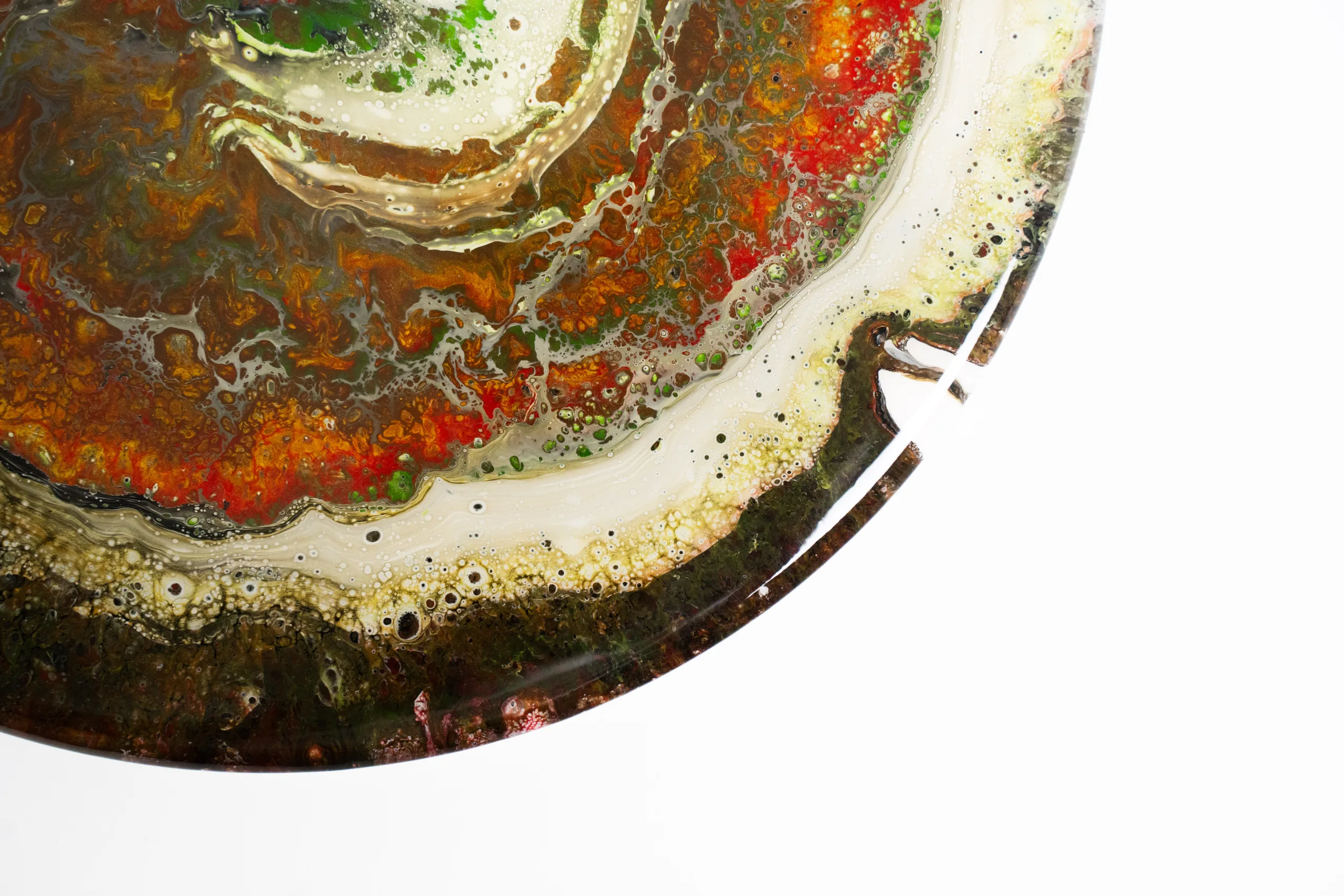 Deska je vytvořena technikou pouringu a následně zalita epoxidovou pryskyřicí, která jí dodává hladký a lesklý povrch. Díky průměru 60 cm, kruhovému tvaru a oblým okrajům je vhodná pro různé podnože Space Root a přinese do interiéru nádech živé organické estetiky.