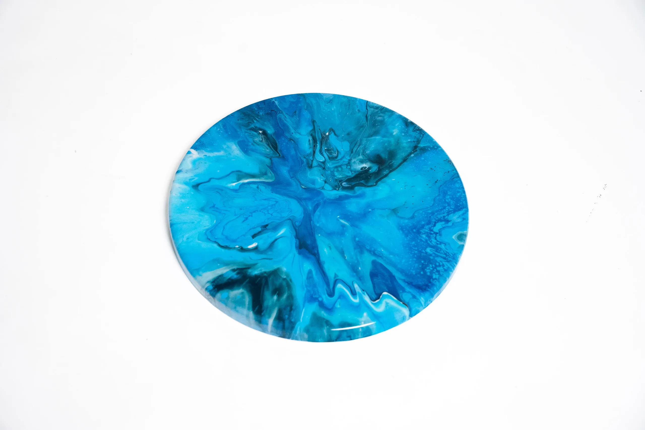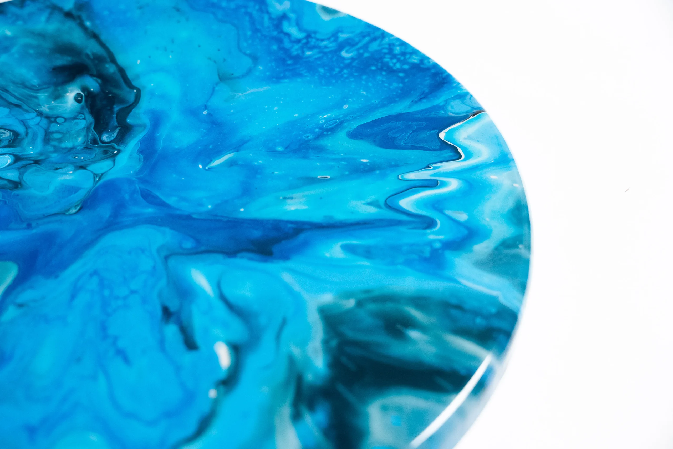 Stolová deska Lume Azur přináší fascinující hru modrých odstínů, které plynule přecházejí do tmavších tónů až k černé. Nerovnoměrné rozpínání barev od středu ke krajům vytváří jedinečný vizuální efekt, který připomíná hlubiny oceánu. Díky technice pouringu a zalití kvalitní epoxidovou pryskyřicí má deska vysoký lesk a luxusní vzhled.