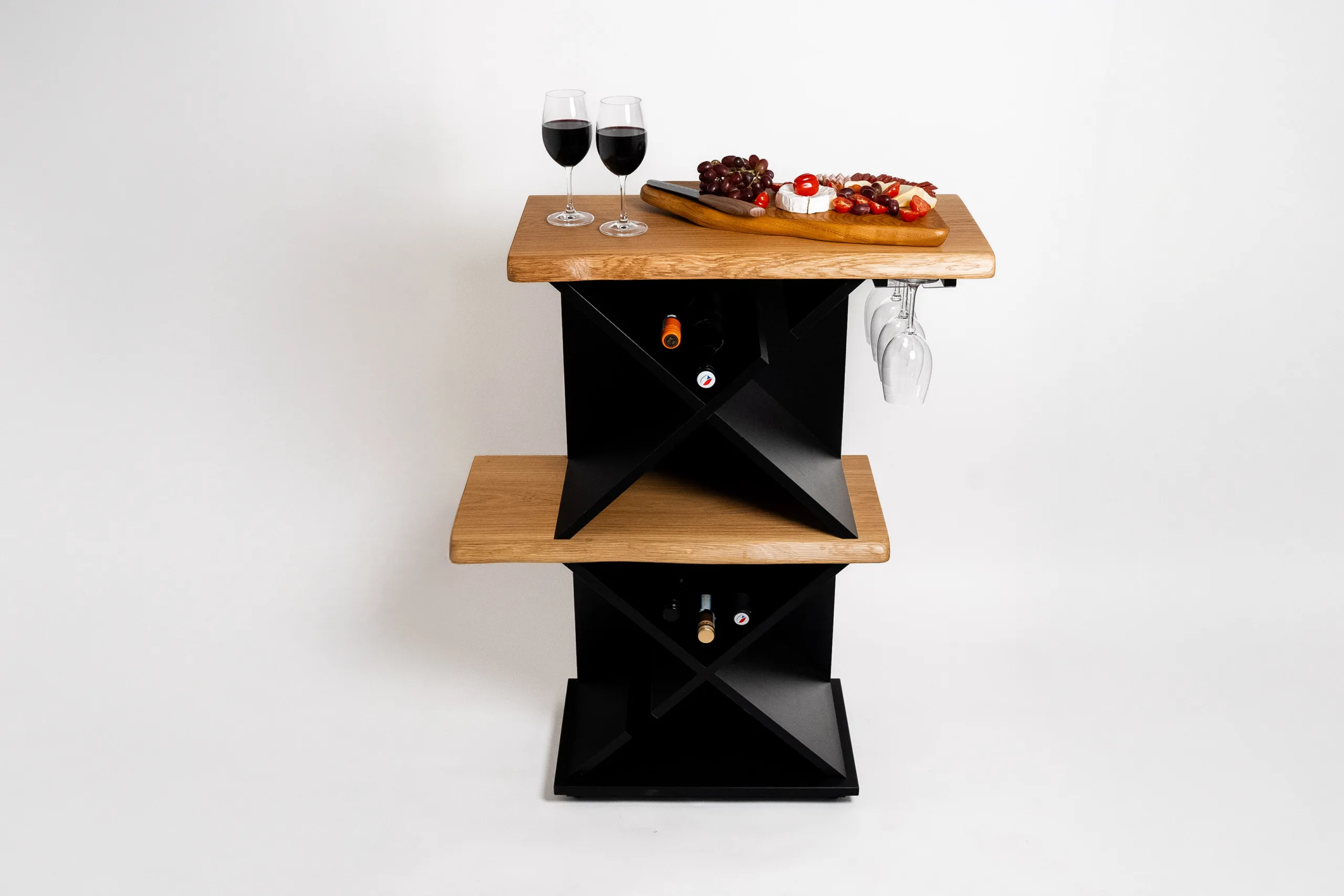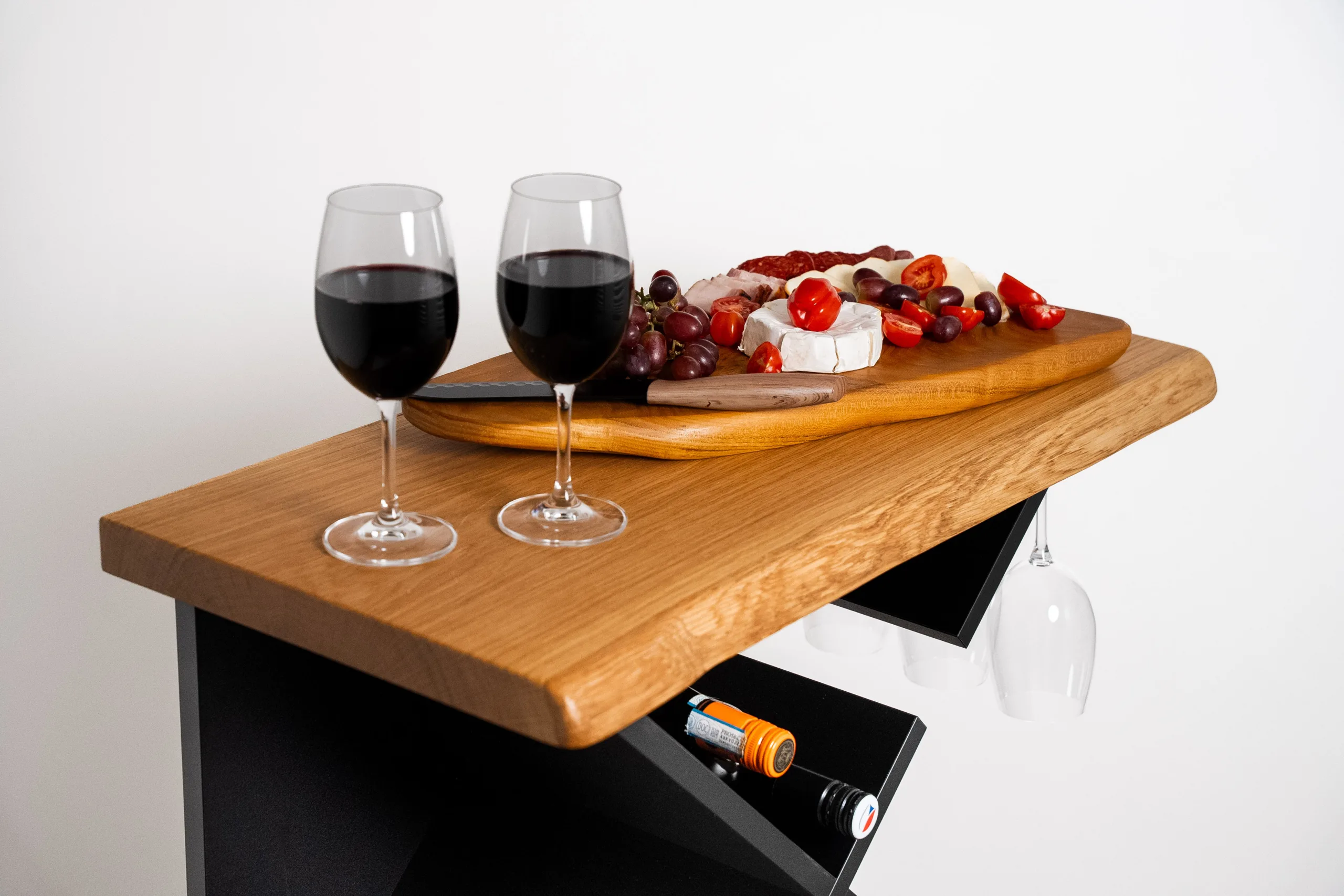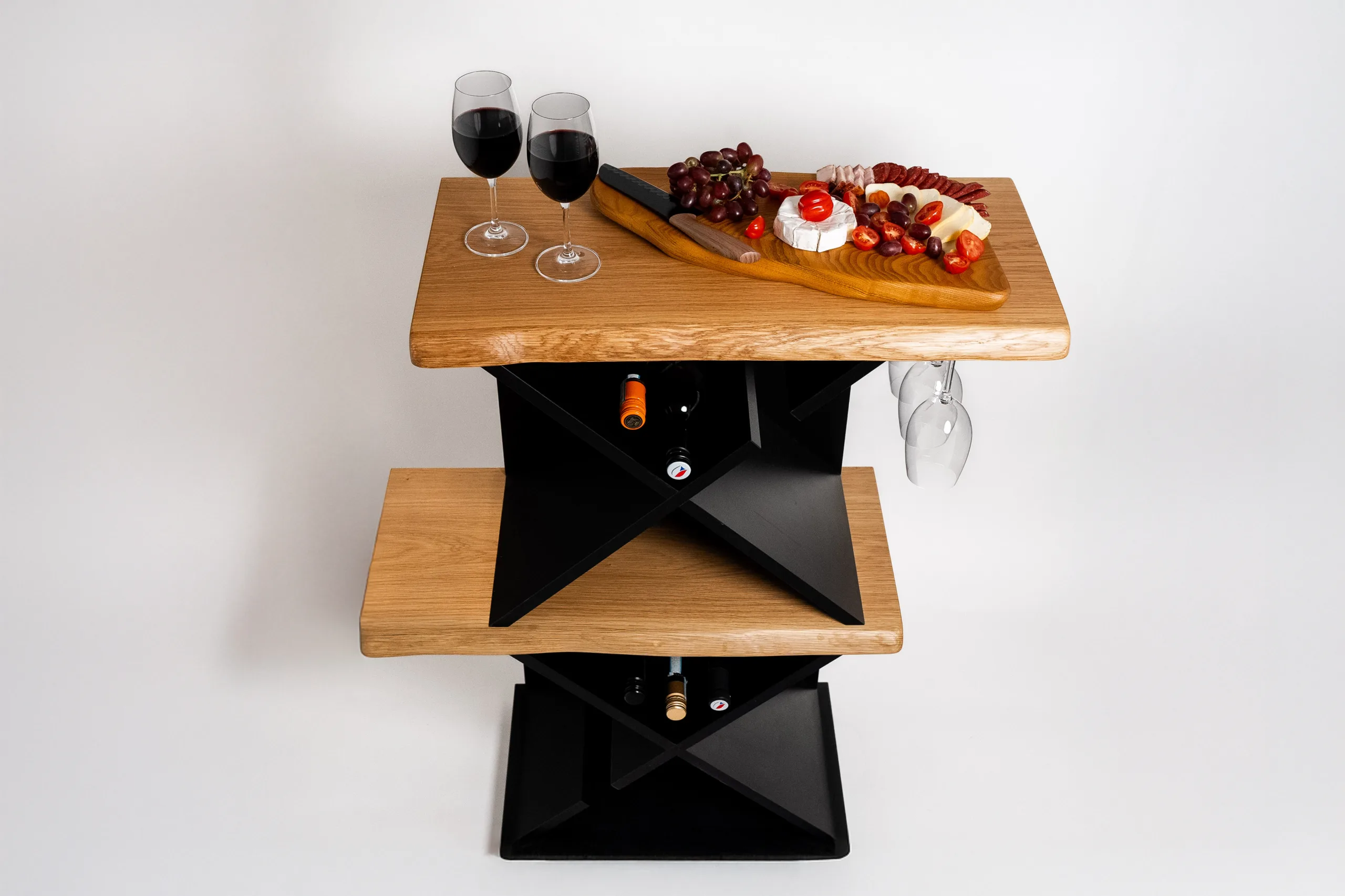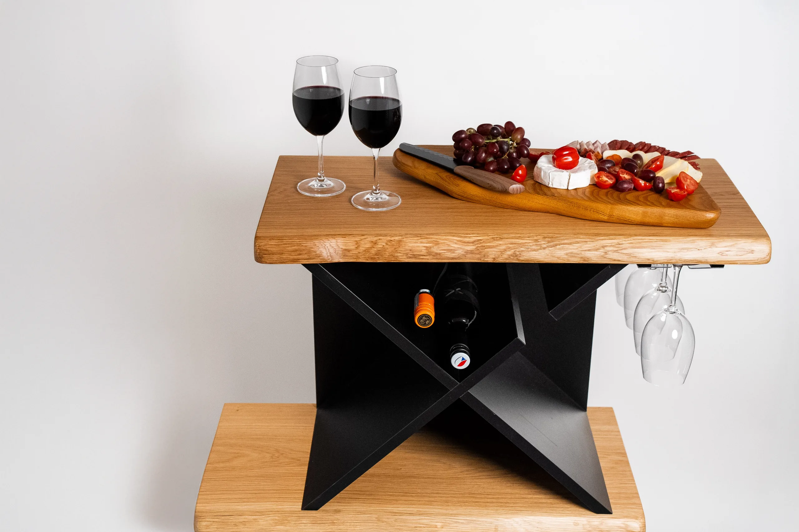Designový stolek na víno Bon Vit kombinuje styl a funkčnost. Pohodlně pojme 24 lahví vína a 4 sklenice, které visí dnem vzhůru, aby zůstaly čisté. Vysoká konstrukce umožňuje pohodlné degustování. Díky úzkému designu nezabere zbytečně mnoho místa. Elegantní kombinace masivu a černého lamina dodává stolku nadčasový vzhled. Perfektní volba pro domácí vinotéku nebo stylový barový kout.